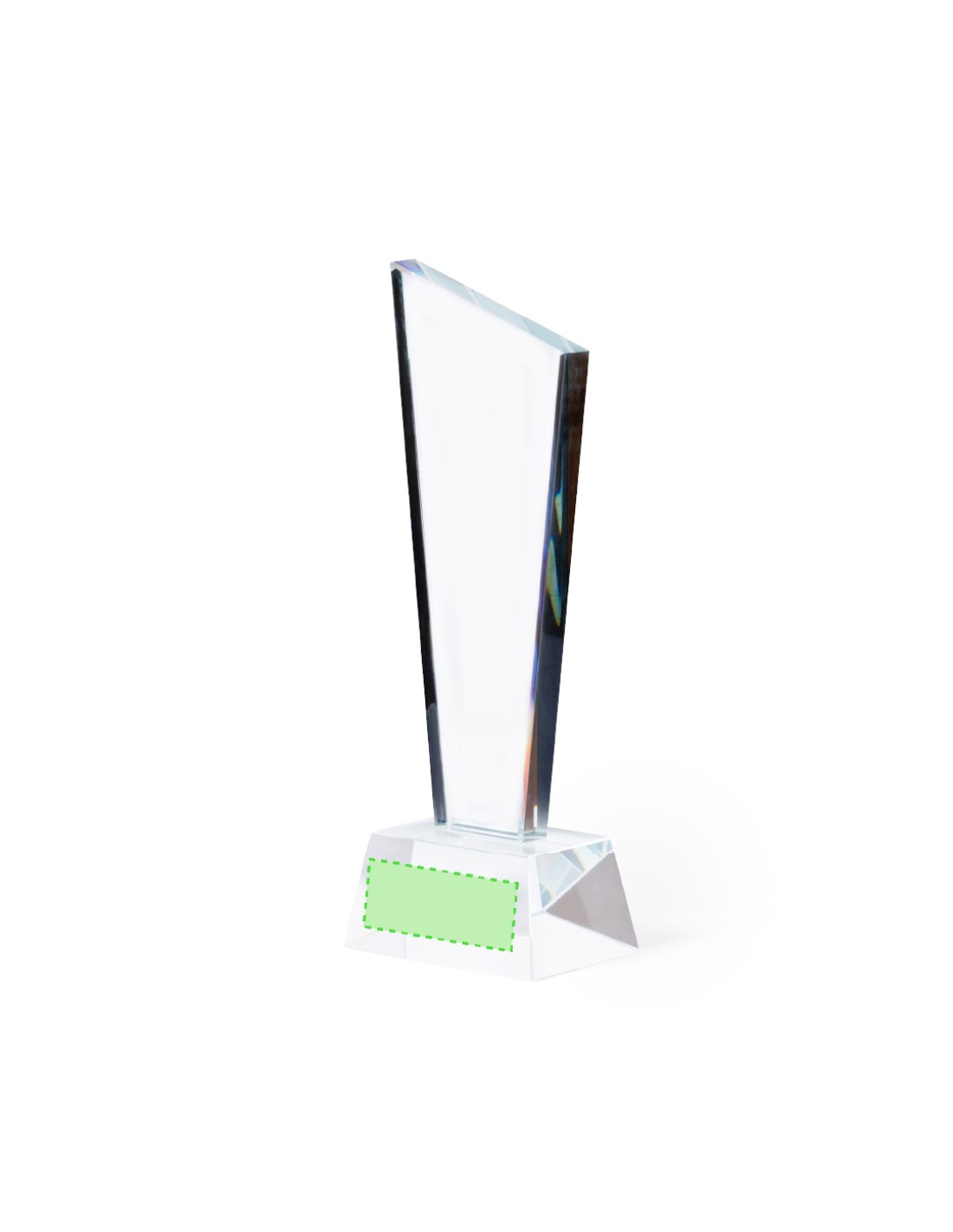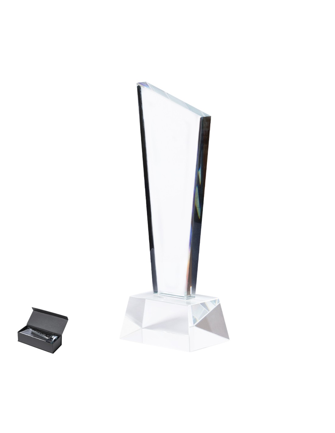 Trofeo de grueso cristal con original diseño y resistente base. Especialmente diseñado para marcaje a láser y presentado en estuche de protección en resistente cartón y cierre magnético, con interior troquelado en espuma.