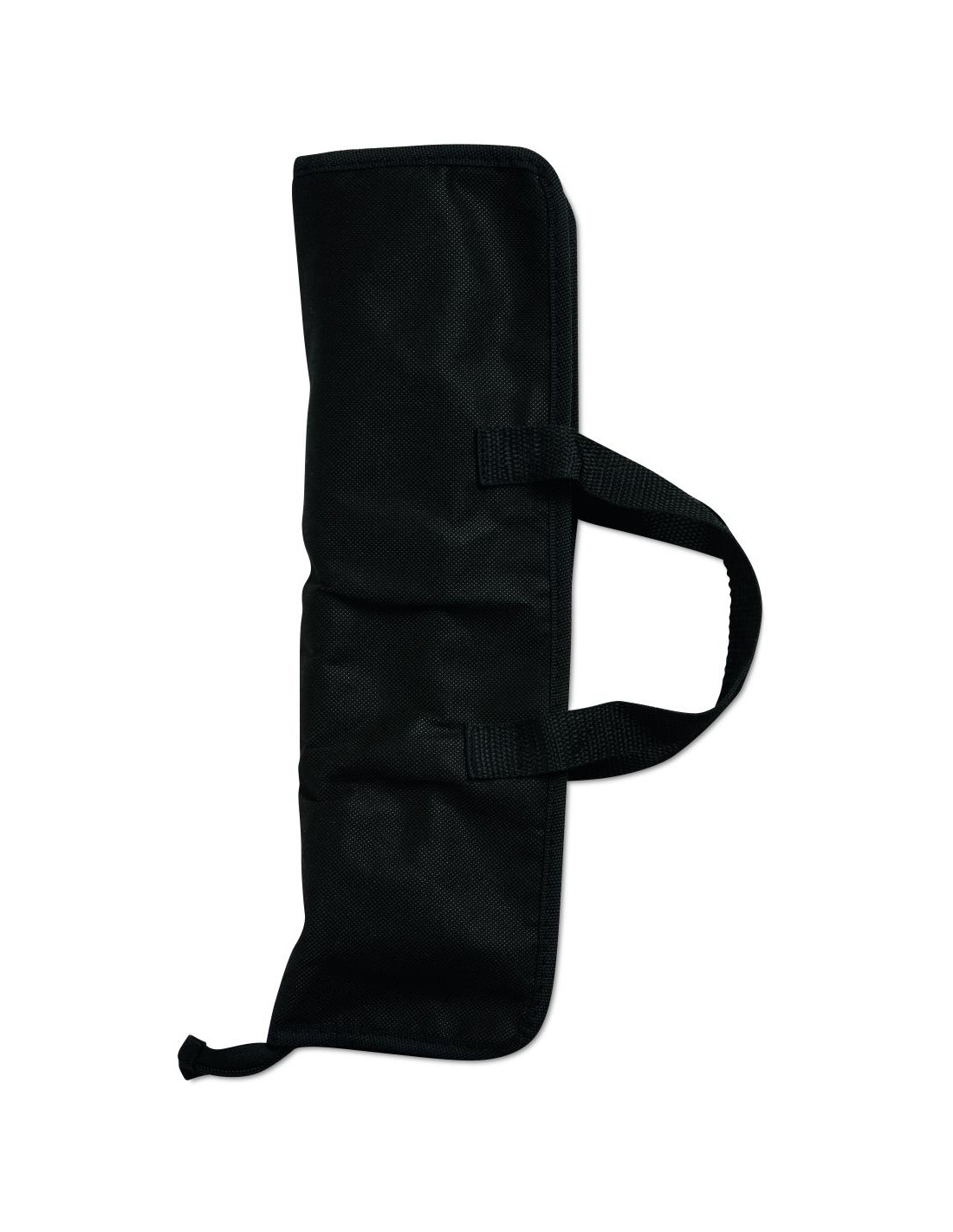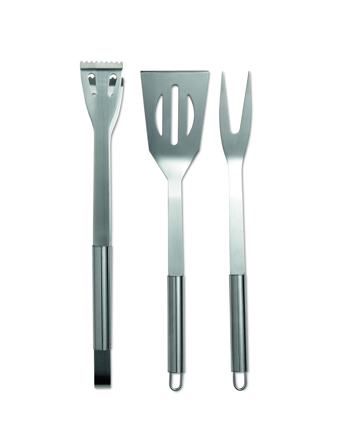Set de 3 herramientas para barbacoa en acero inoxidable con funda de non woven con cremallera. Incluye pinzas, espátula y tenedor para barbacoa.