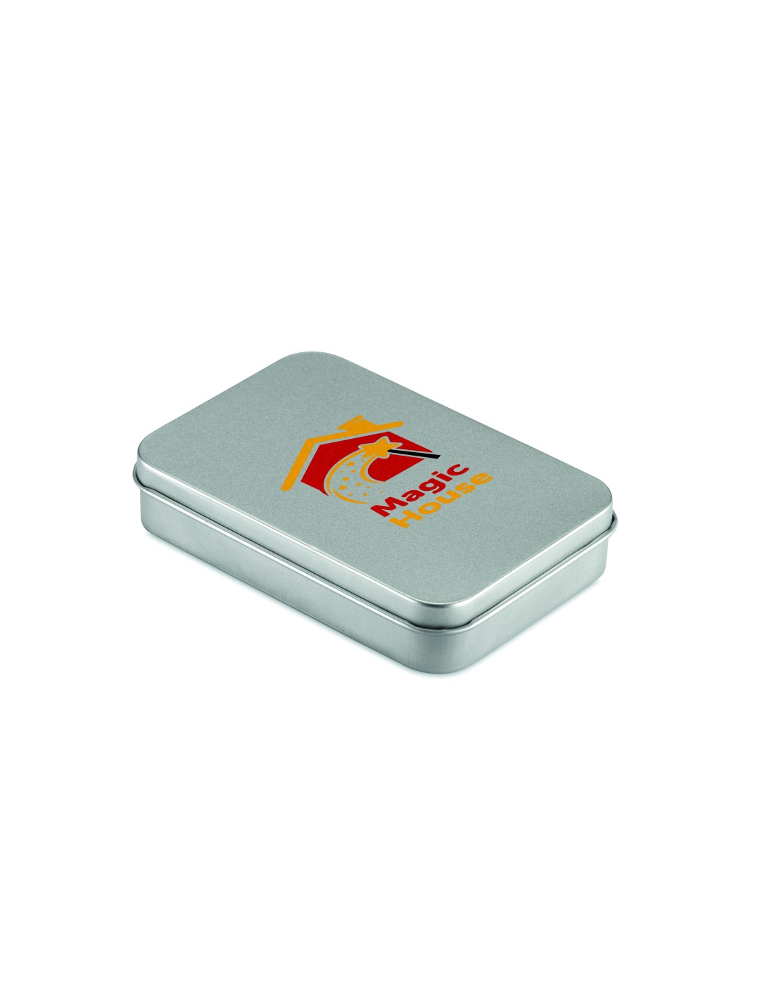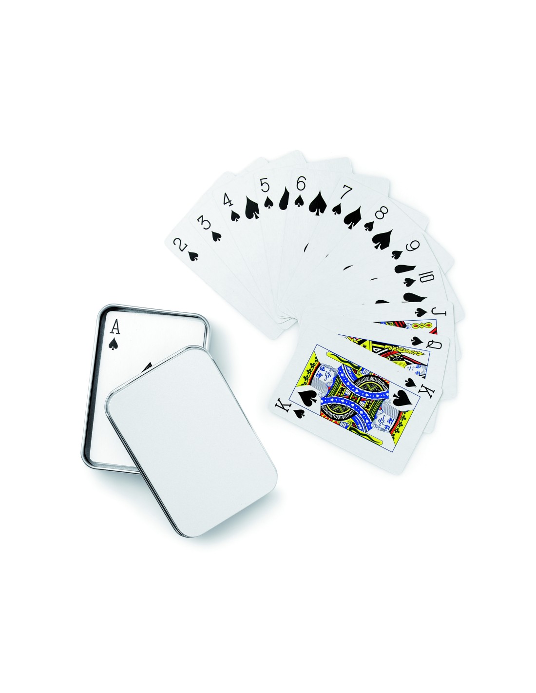 Baraja francesa de 54 cartas, presentada en caja de metal.