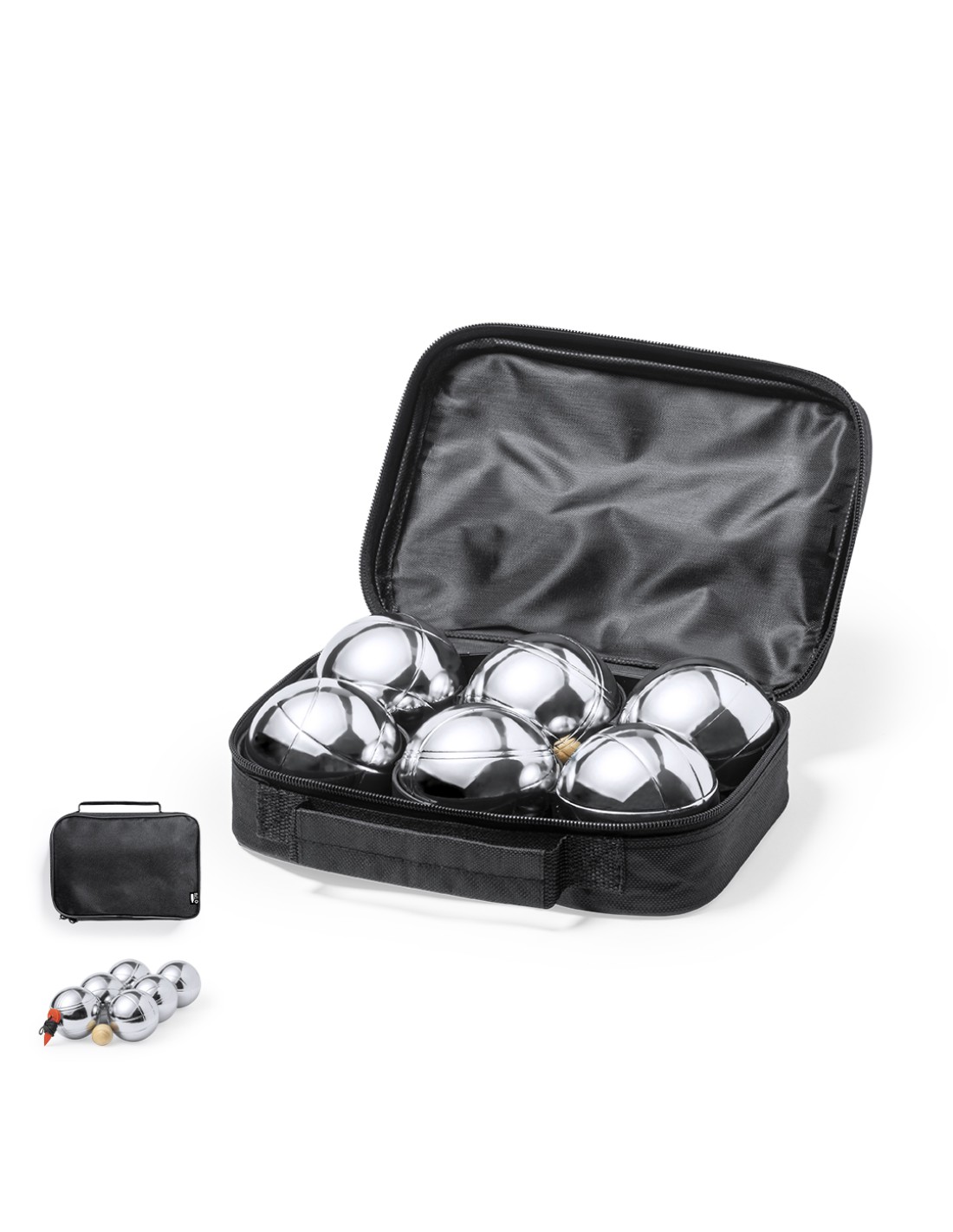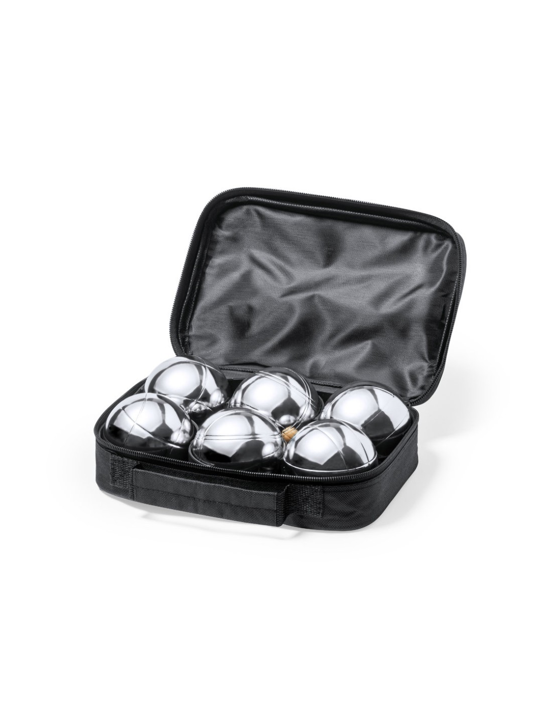 Juego de petanca de alta calidad. Incluye 6 bolas metálicas, boliche en madera y cuerda de medición. Set en resistente funda de RPET negra con asa de transporte y cierre de cremallera a juego. Distintitivo RPET en etiqueta exterior.El material RPET se elabora a partir de plástico reciclado, para así fomentar la reutilización de residuos plásticos y ayudar a la sostenibilidad del planeta.