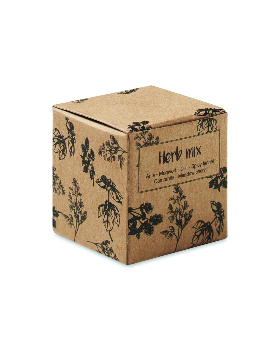 Kit de cultivo de semillas bomba presentado en caja de cartón. Incluye semillas de anís, artemisia vulgaris, eneldo, hinojo, manzanilla y perejil d…
