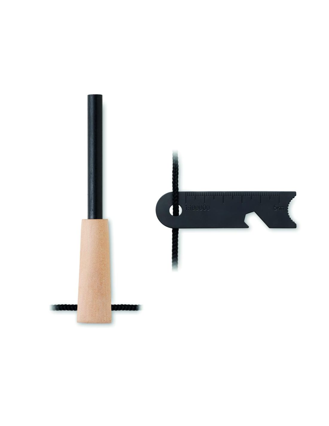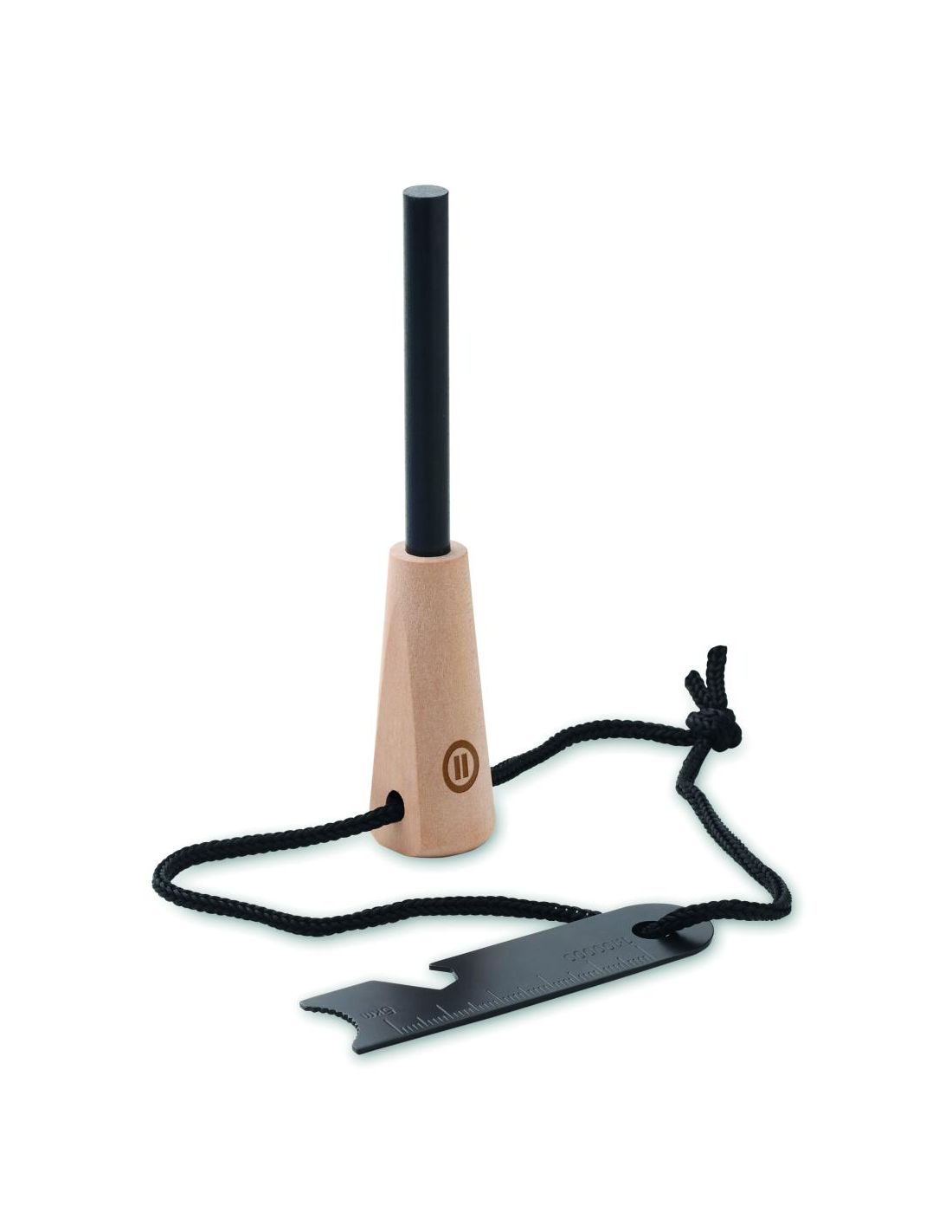 Herramientas para encender fuego en madera de pino y acero inoxidable que incluyen una varilla para encender fuego, un rascador multiusos para utilizar con el encendedor, un abridor de botellas, una regla de precisión y una llave hexagonal.