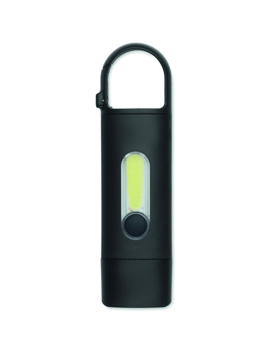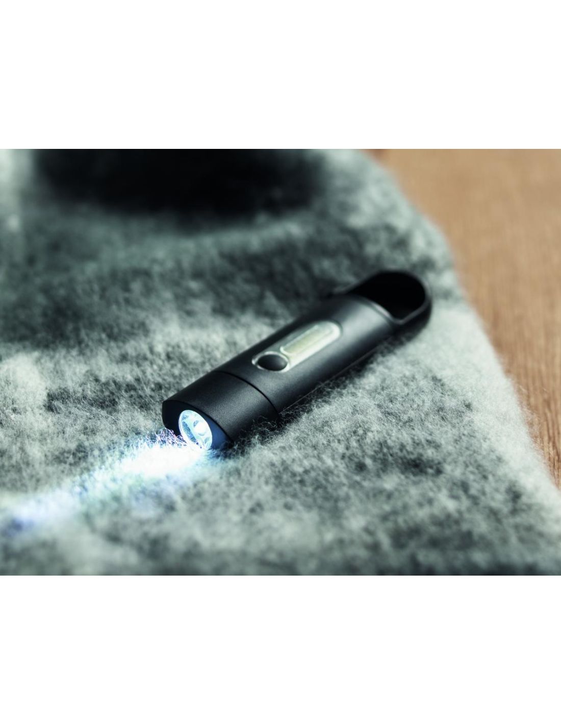 Linterna COB recargable de bolsillo con mosquetón en ABS. Luz de emergencia y 3 modos de iluminación. 1 pila recargable de litio de 3,7 V y 200 mAh (incluida, no sustituible).
