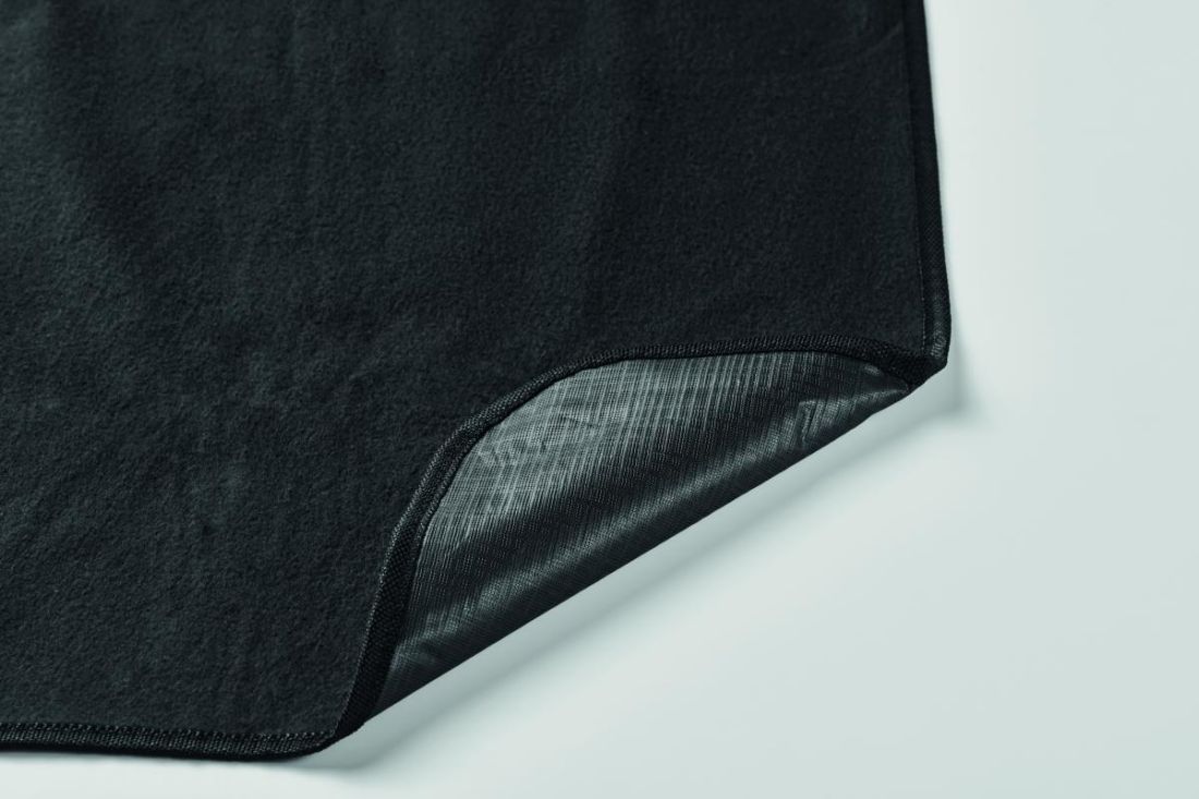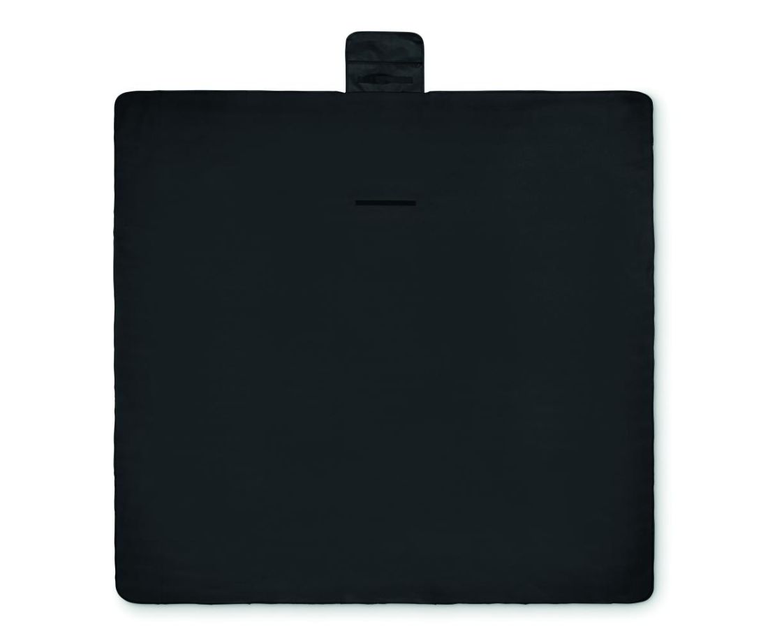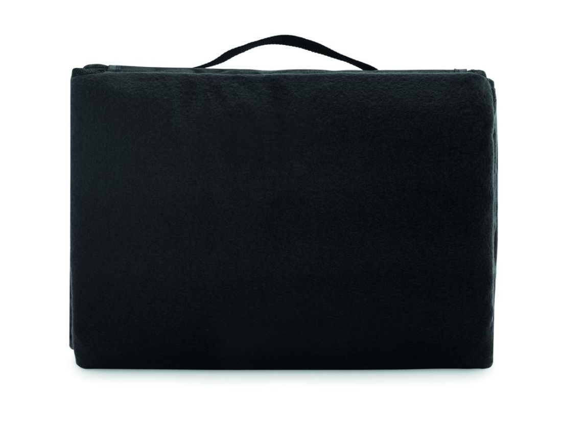 Manta de picnic plegable de forro polar RPET 150 gr/m² (68% poliéster reciclado/32% poliéster normal) con reverso de PEVA revestido resistente al agua. Solapa frontal con bolsillo con cremallera y asa.