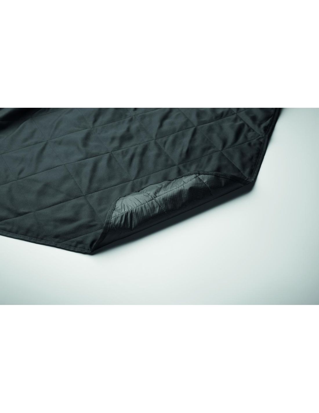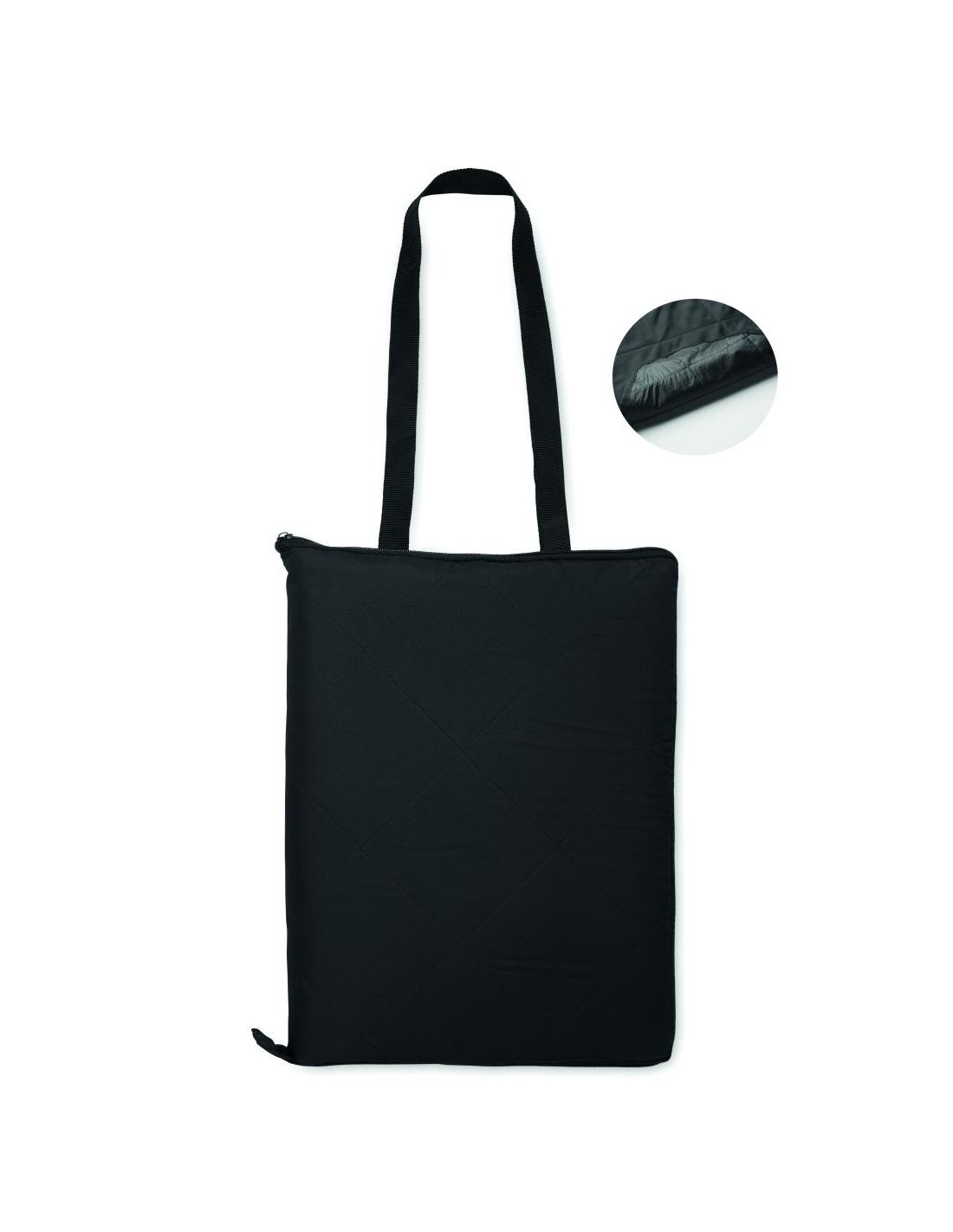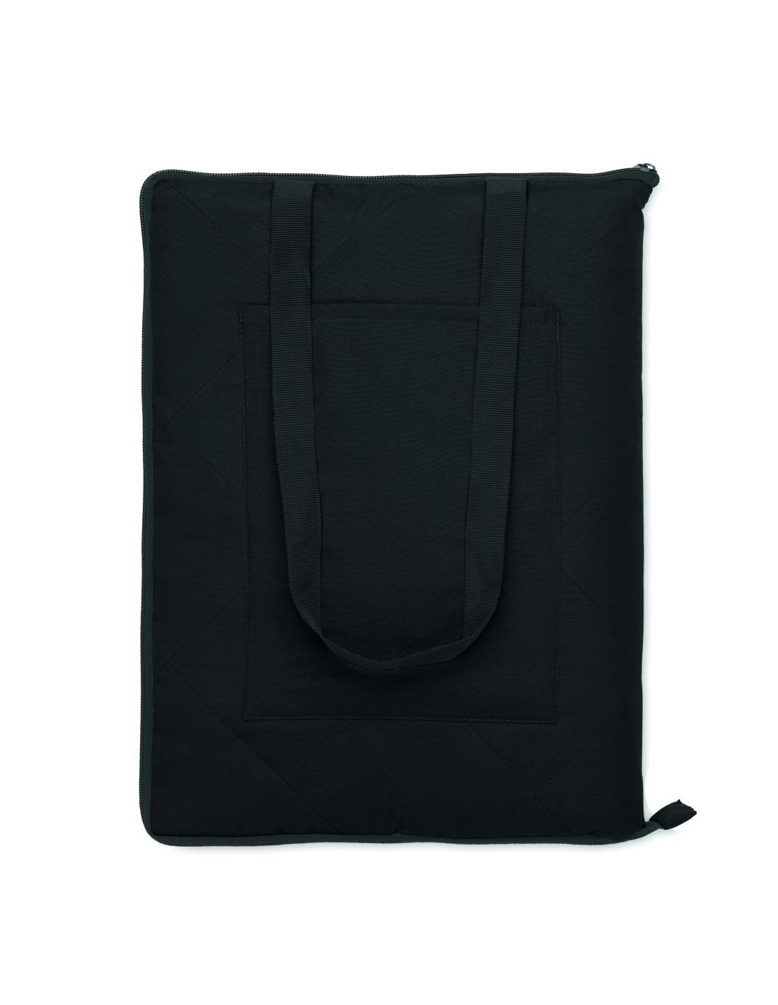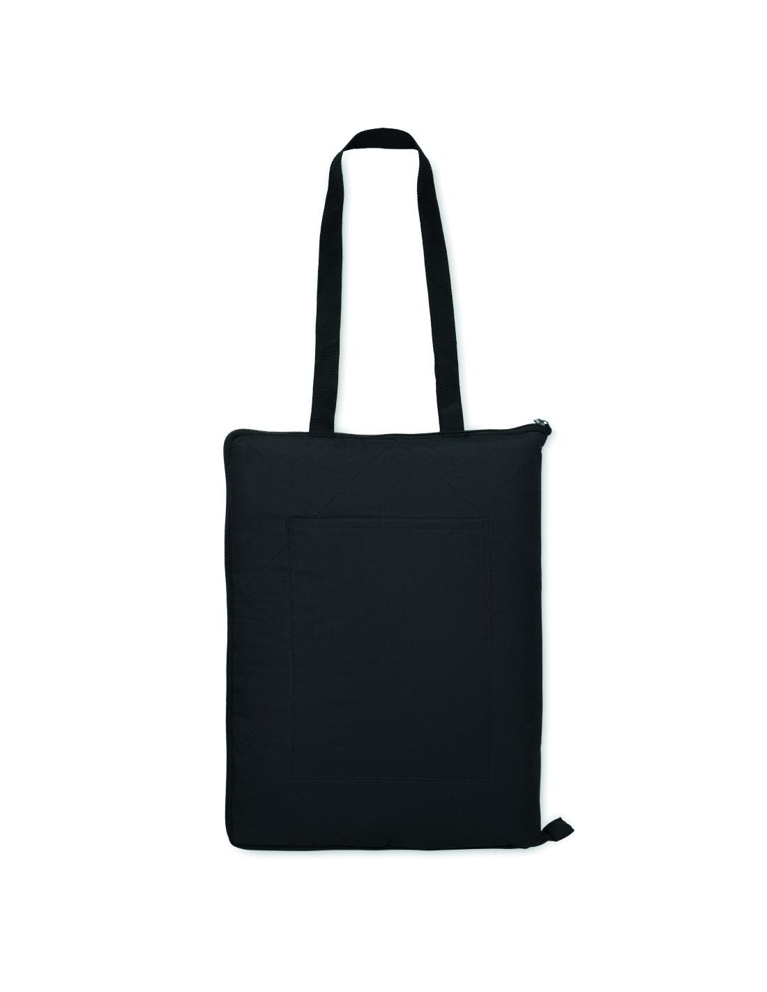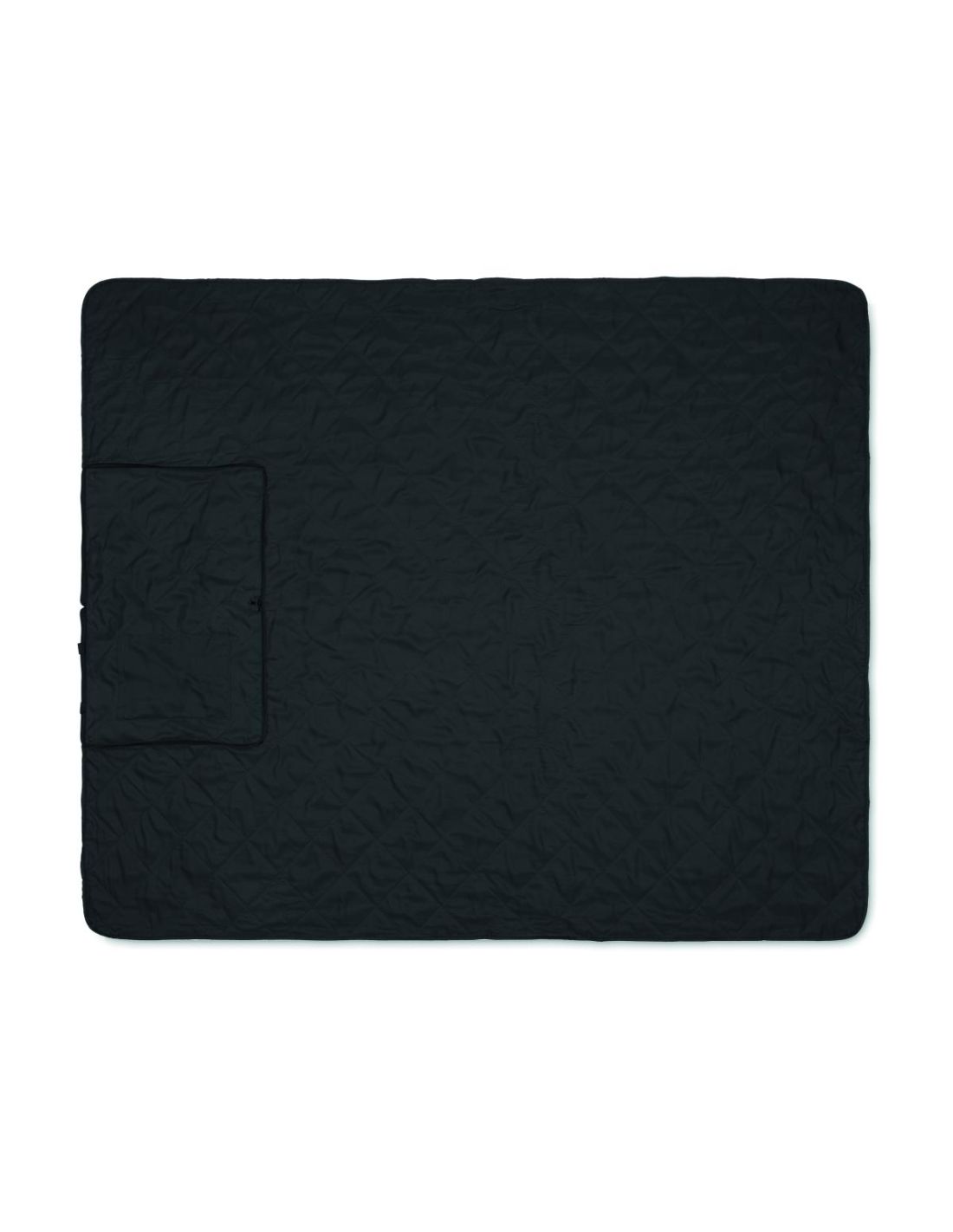 Manta de picnic acolchada y plegable con revestimiento de plástico PEVA en el reverso. Se pliega en una práctica bolsa de asas y tiene una correa ajustable para el hombro. Incluye un gran bolsillo lateral delantero.
