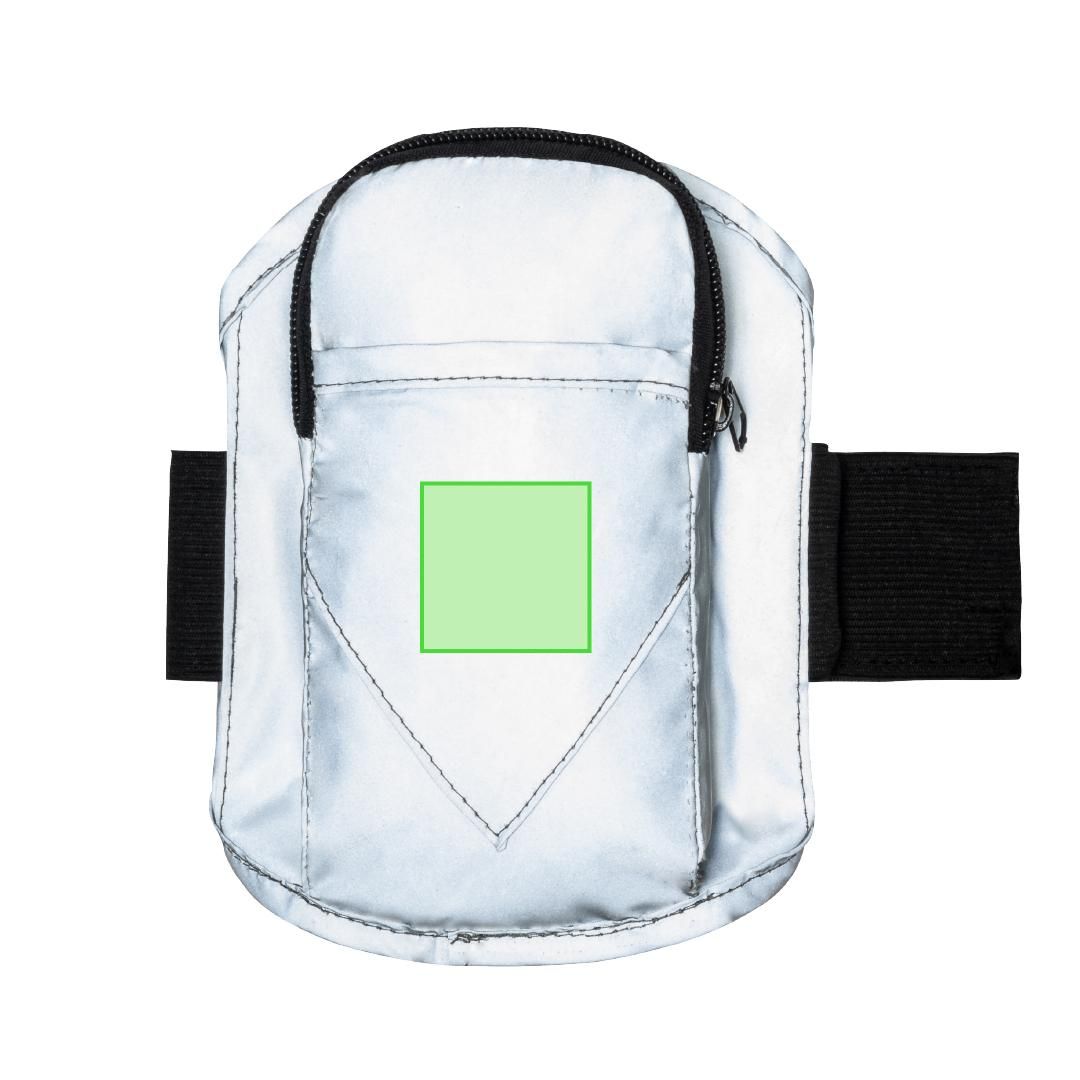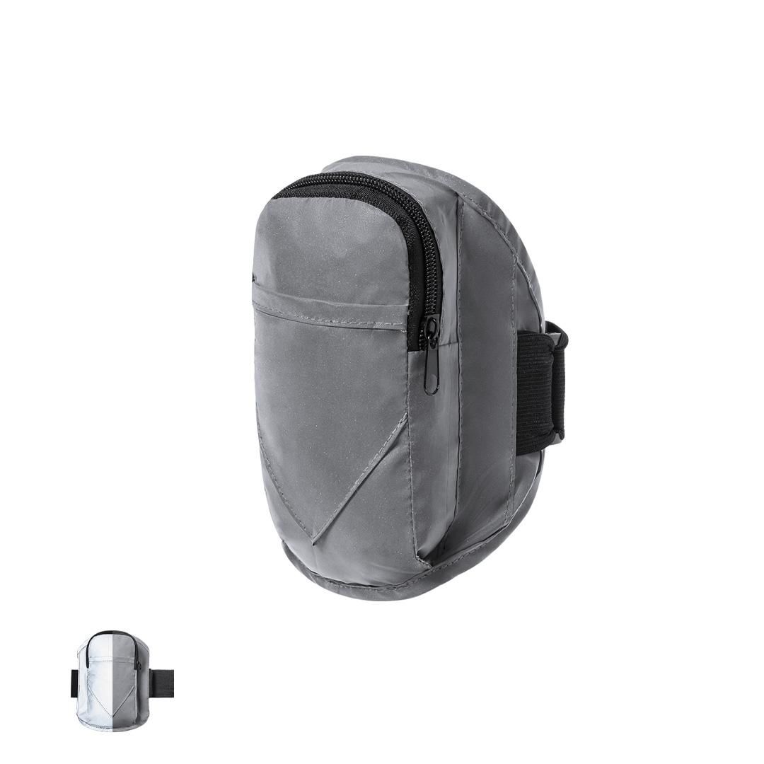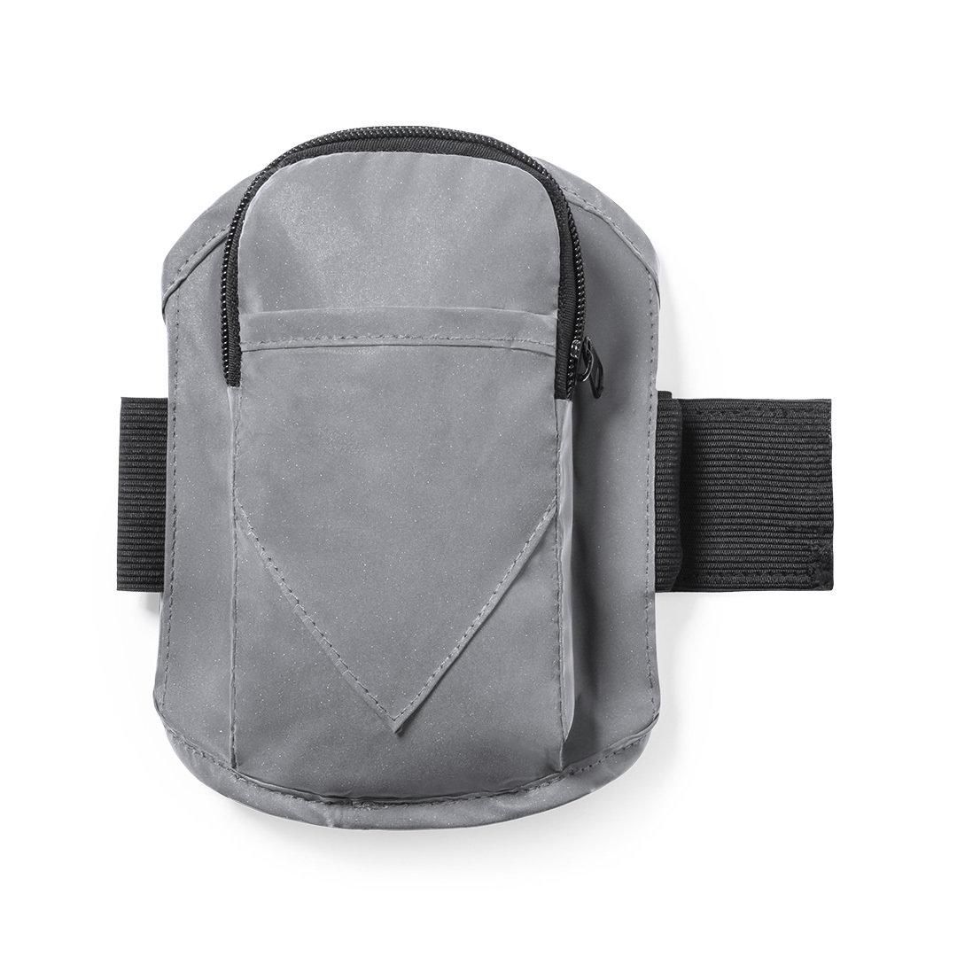 Brazalete deportivo en poliéster 210T, fabricado empleando tejido con gran capacidad para reflejar intensamente la luz, gracias a millones de pigmentos reflectantes y basándose en el principio de la retro-reflexión de la luz, una propiedad de visibilidad nocturna que consiste en la refracción de la luz hacia la fuente de origen de la misma. Bolsillo principal con cierre de cremallera y bolsillo frontal con cierre de velcro. Con tira ajustable elástica y resistente al agua.
