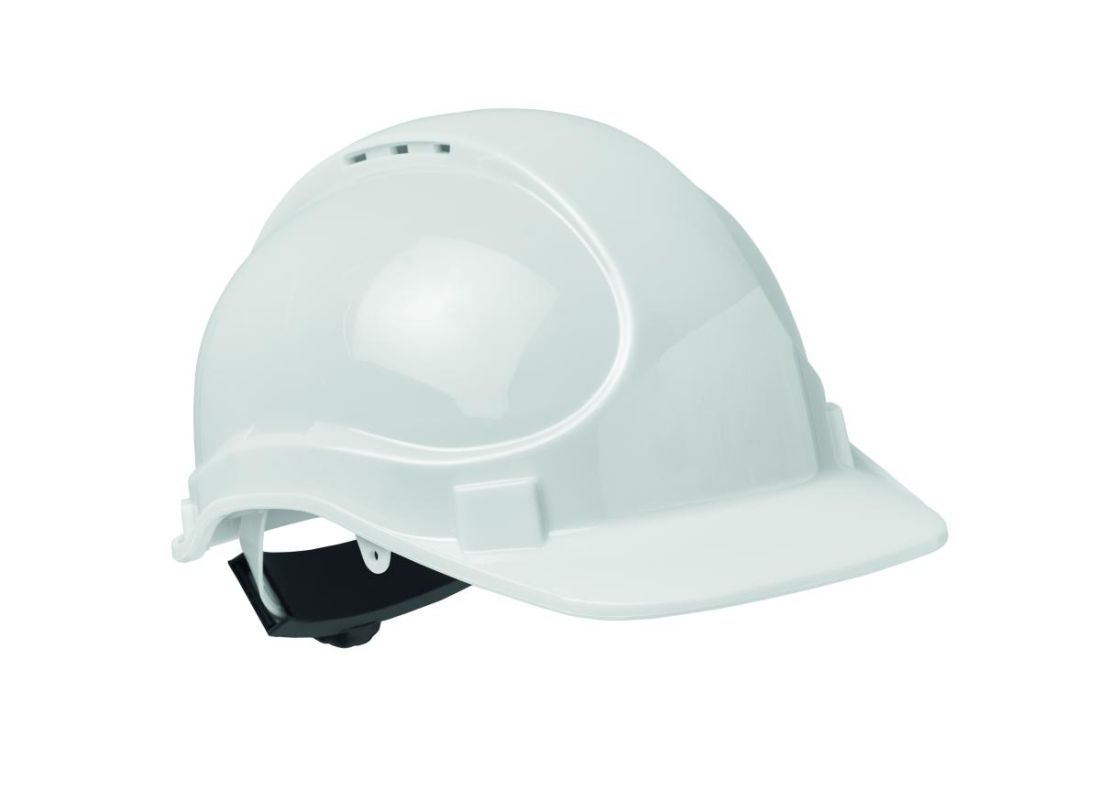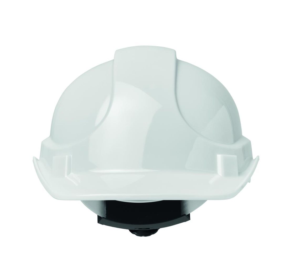 Casco en ABS para constructores y almacenes. Equipado con salidas de aire, correa para la barbilla extraíble y banda para el sudor. Diadema ajustable (50-62cm). EN397