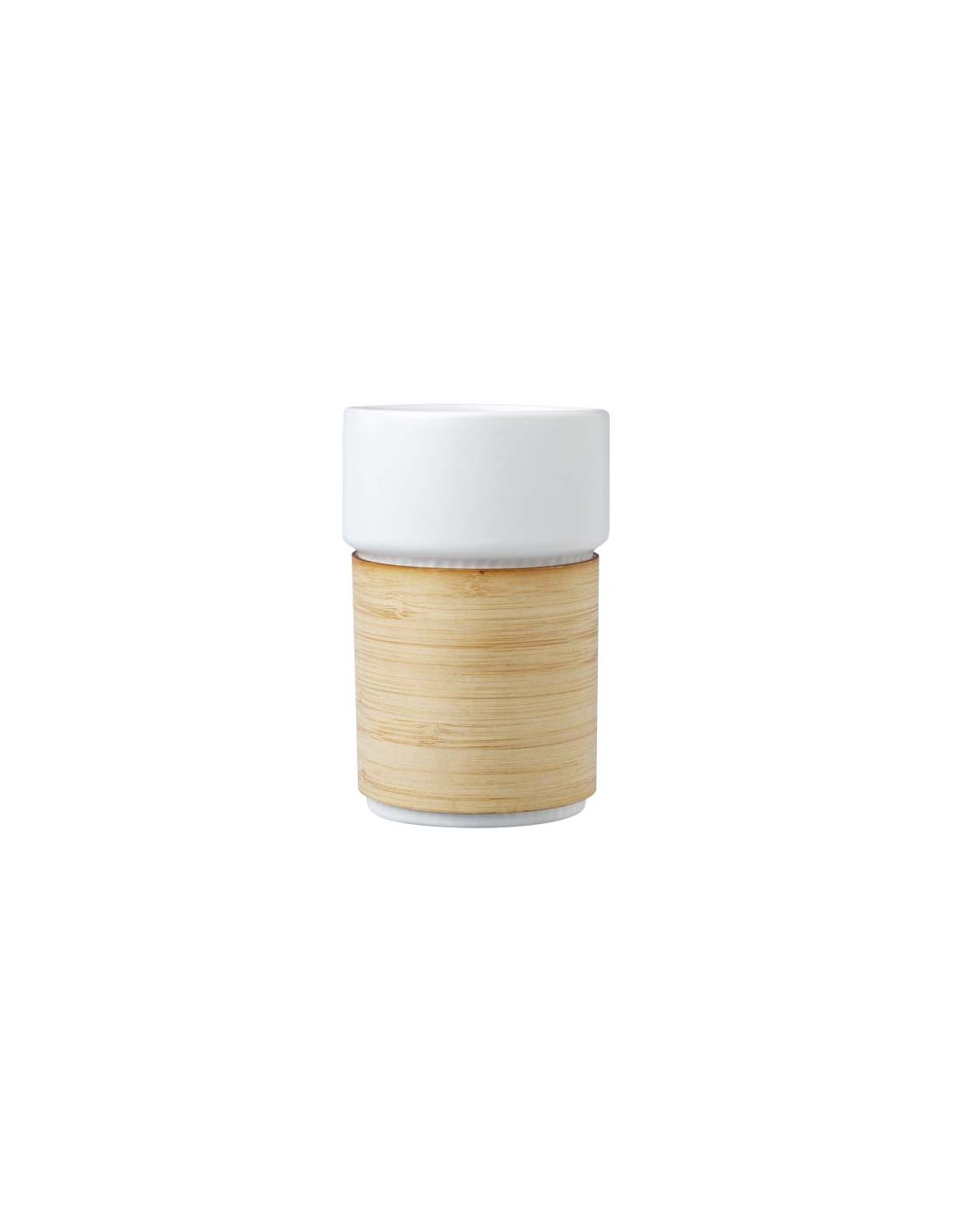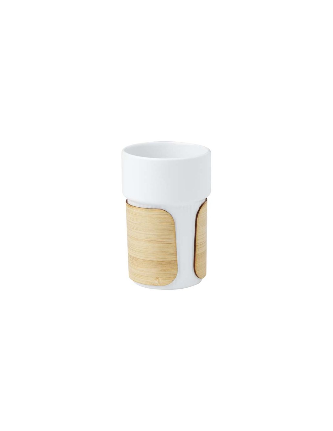 El elegante vaso de cerámica \ tiene una funda de bambú extraíble ideal para tomar bebidas calientes. El bambú utilizado procede de fuentes sostenibles, ecológicas y socialmente responsables. Capacidad: 340 ml. Se presenta en una caja de cartón reciclado.