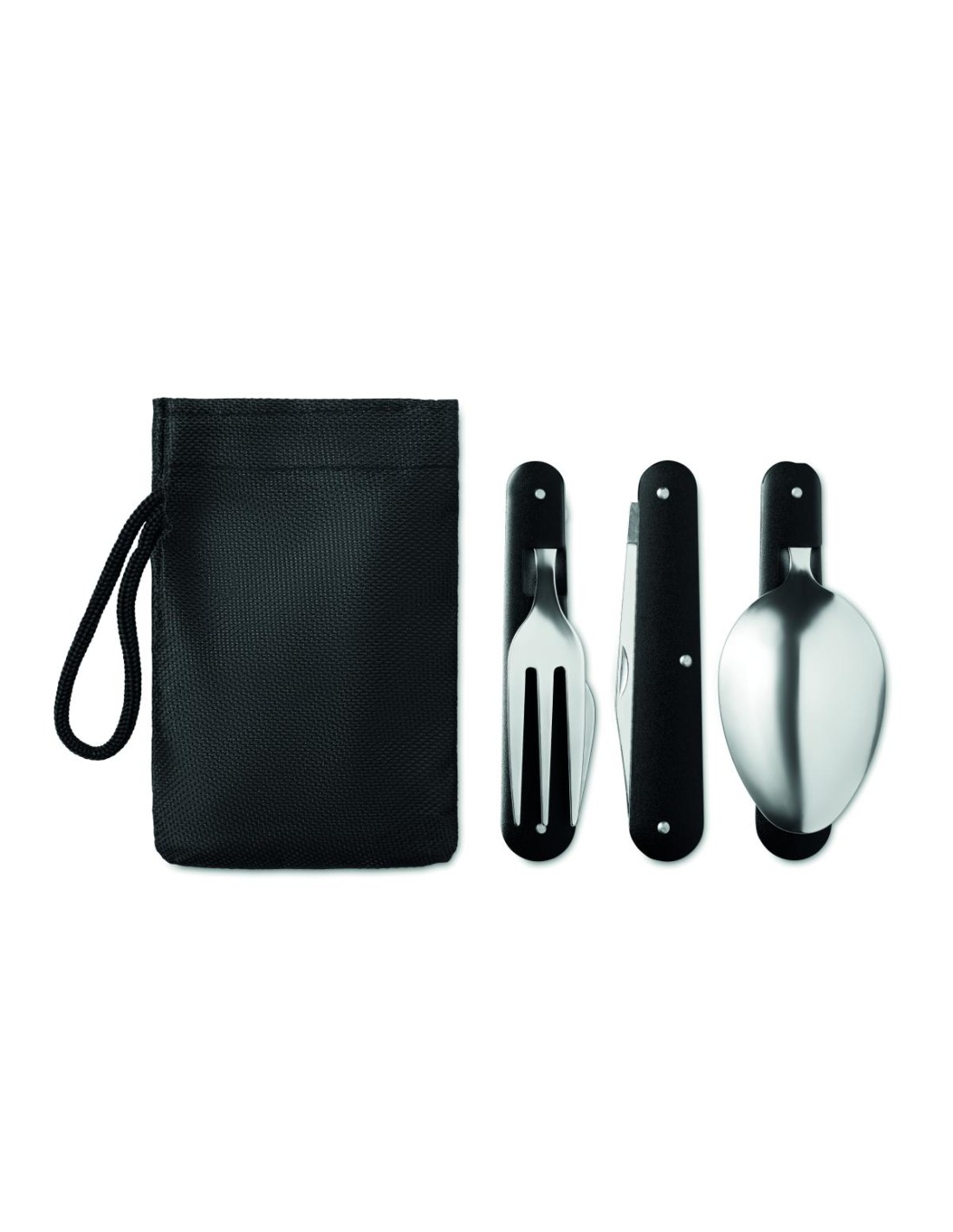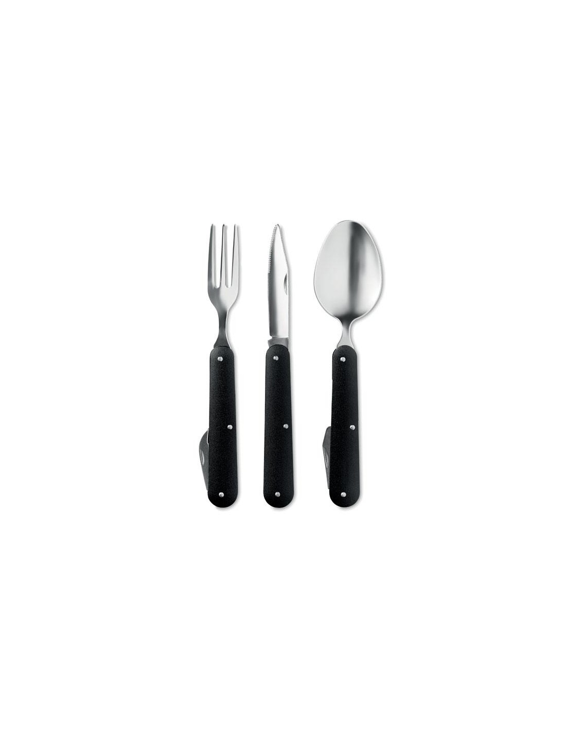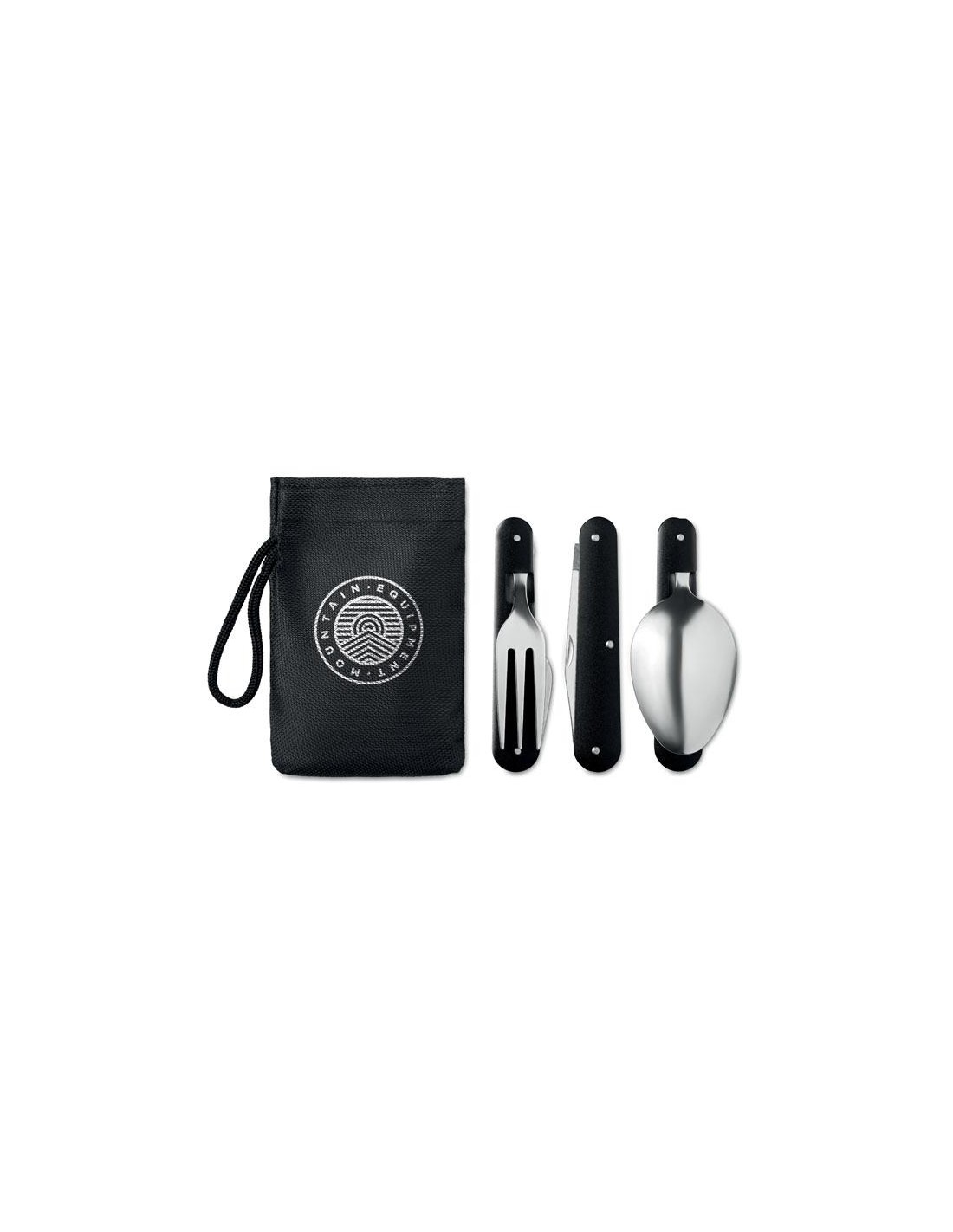 Cubiertos de camping de acero inoxidable y mango de aluminio. Conjunto de cuchara, tenedor y cuchillo en caja blanca.
