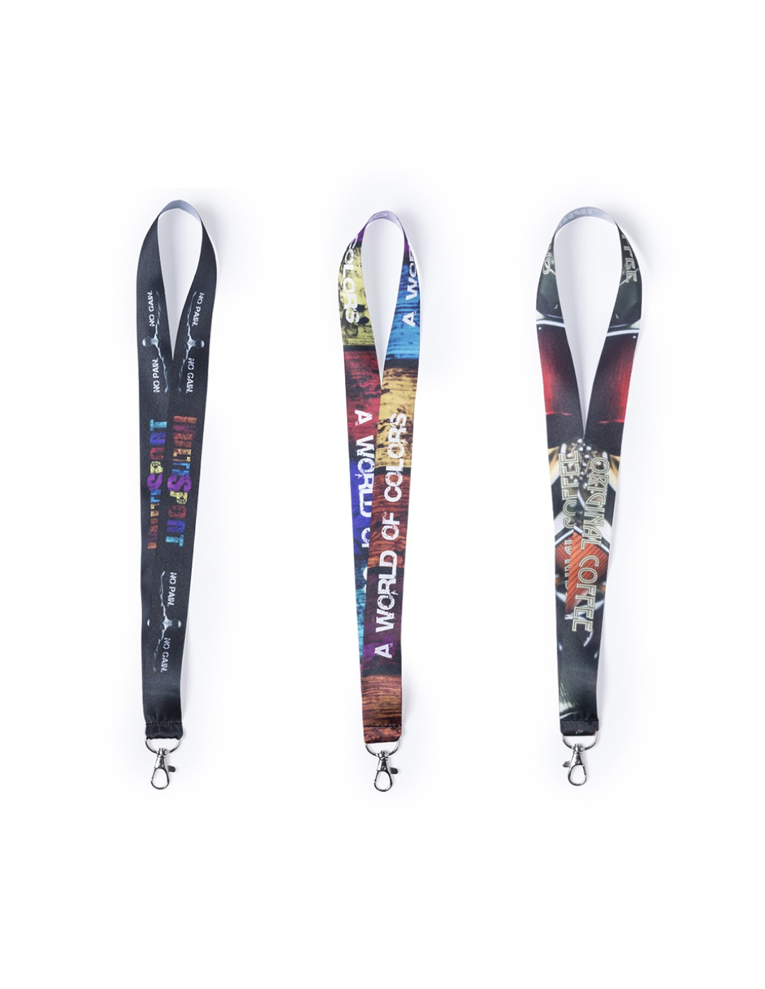 Lanyard con tiras de ancho especial en resistente y suave poliéster con accesorio mosquetón metálico. Especialmente diseñado para personalización total en sublimación para pedidos a partir de 250 piezas.