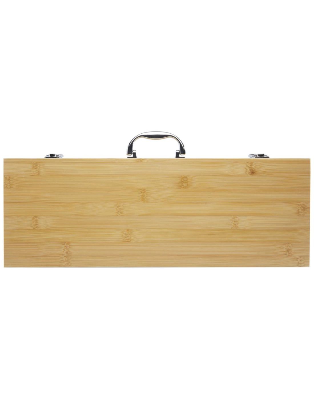 Juego de barbacoa de 3 piezas de bambú con pala (42 x 9,5 cm), pinza (46 x 2,2 cm) y tenedor (43 x 3,2 cm). El set se entrega en una caja de regalo de bambú (51,5 x 18,2 x 7,2 cm). Los mangos y la caja de regalo están hechos de bambú obtenido y producido según normas de sostenibilidad.