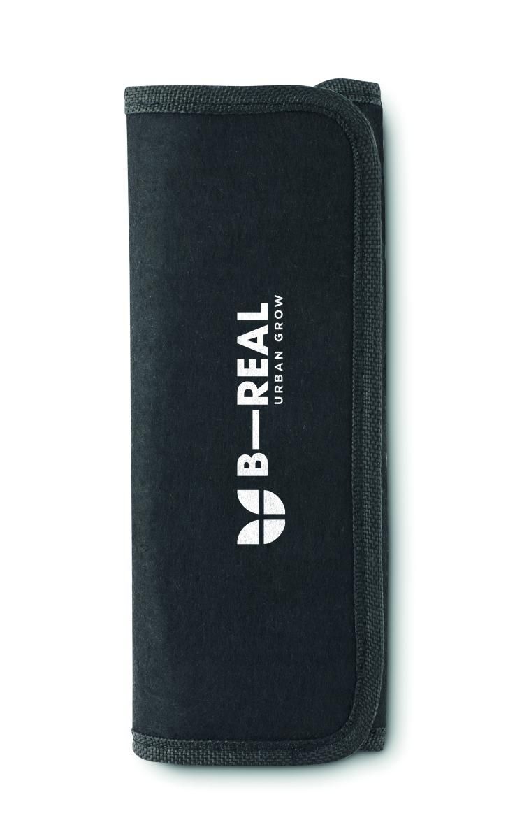 Set de 3 herramientas de jardinería. Rastrillo y 2 palas. Presentado en bolsa de fieltro RPET.