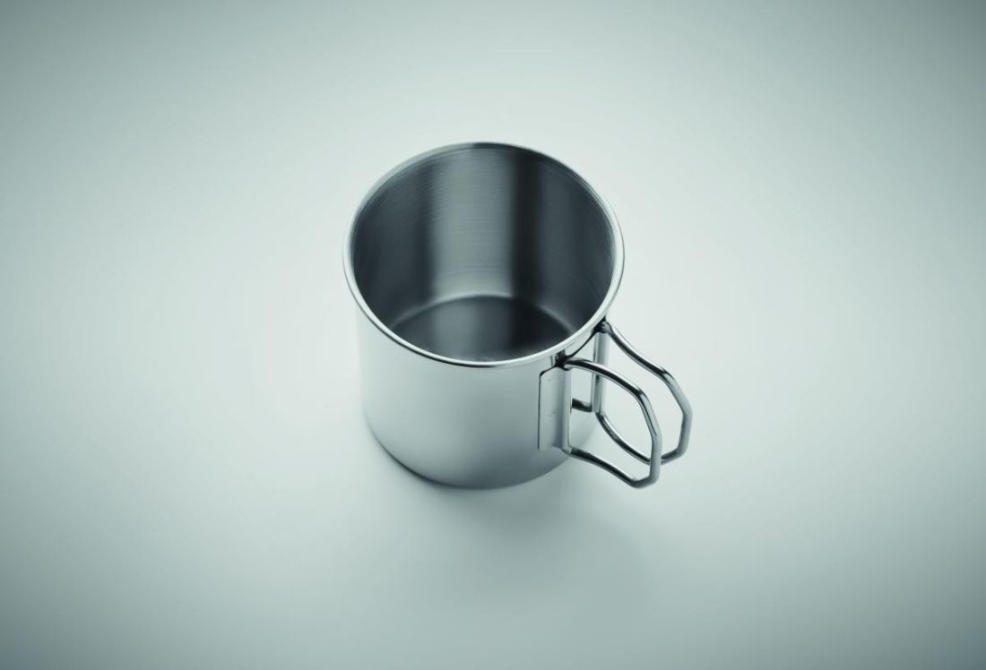 Taza de acero inoxidable de pared simple con asa plegable. Capacidad: 330 ml. Al tratarse de un vaso de una sola pared, puede producirse transferencia de calor.