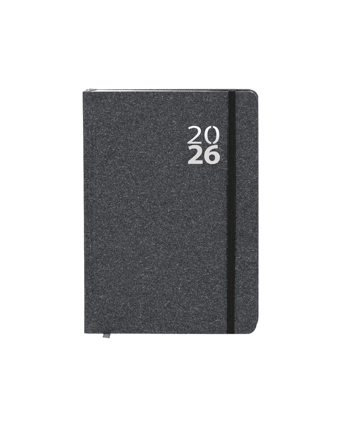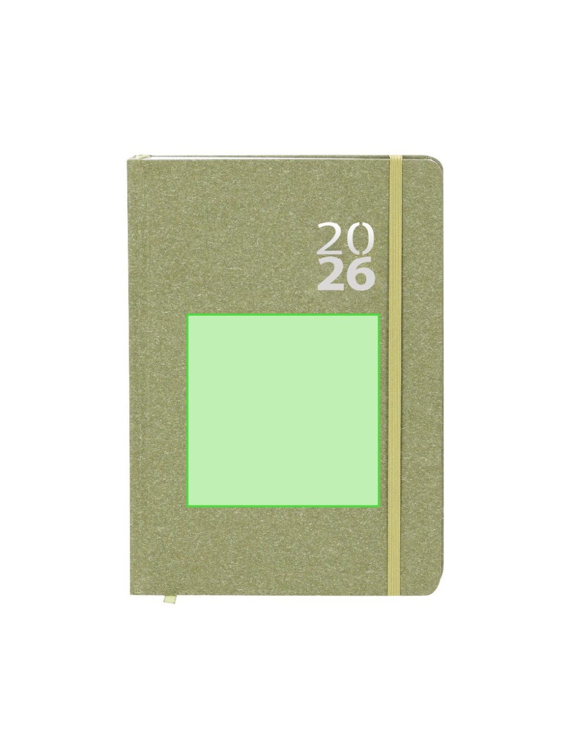 Agenda de tamaño A5 en Cartón Reciclado. Con cubiertas rígidas y elástico de cierre a juego. Incluye caja kraft de presentación. Con distintitivo...