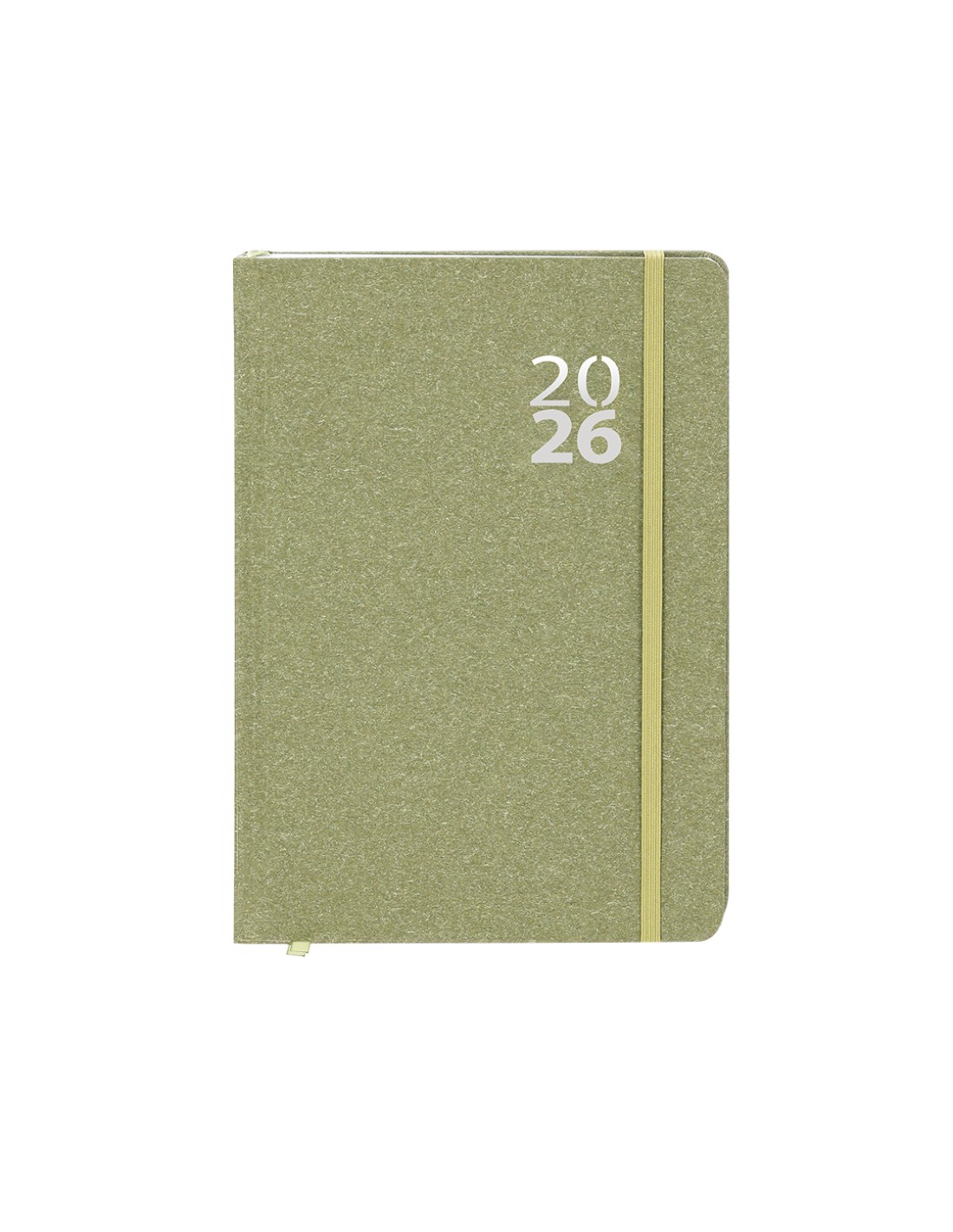Agenda de tamaño A5 en Cartón Reciclado. Con cubiertas rígidas y elástico de cierre a juego. Incluye caja kraft de presentación. Con distintitivo ECO.Diseño página día, zona de anotaciones y marcapáginas de tela. En 2 idiomas: castellano e inglés. El Cartón Reciclado proviene del reaprovechamiento de excedente de fabricaciones y reciclaje de papel en el final de su vida útil, convirtiéndose en un lienzo ecológico y sostenible.