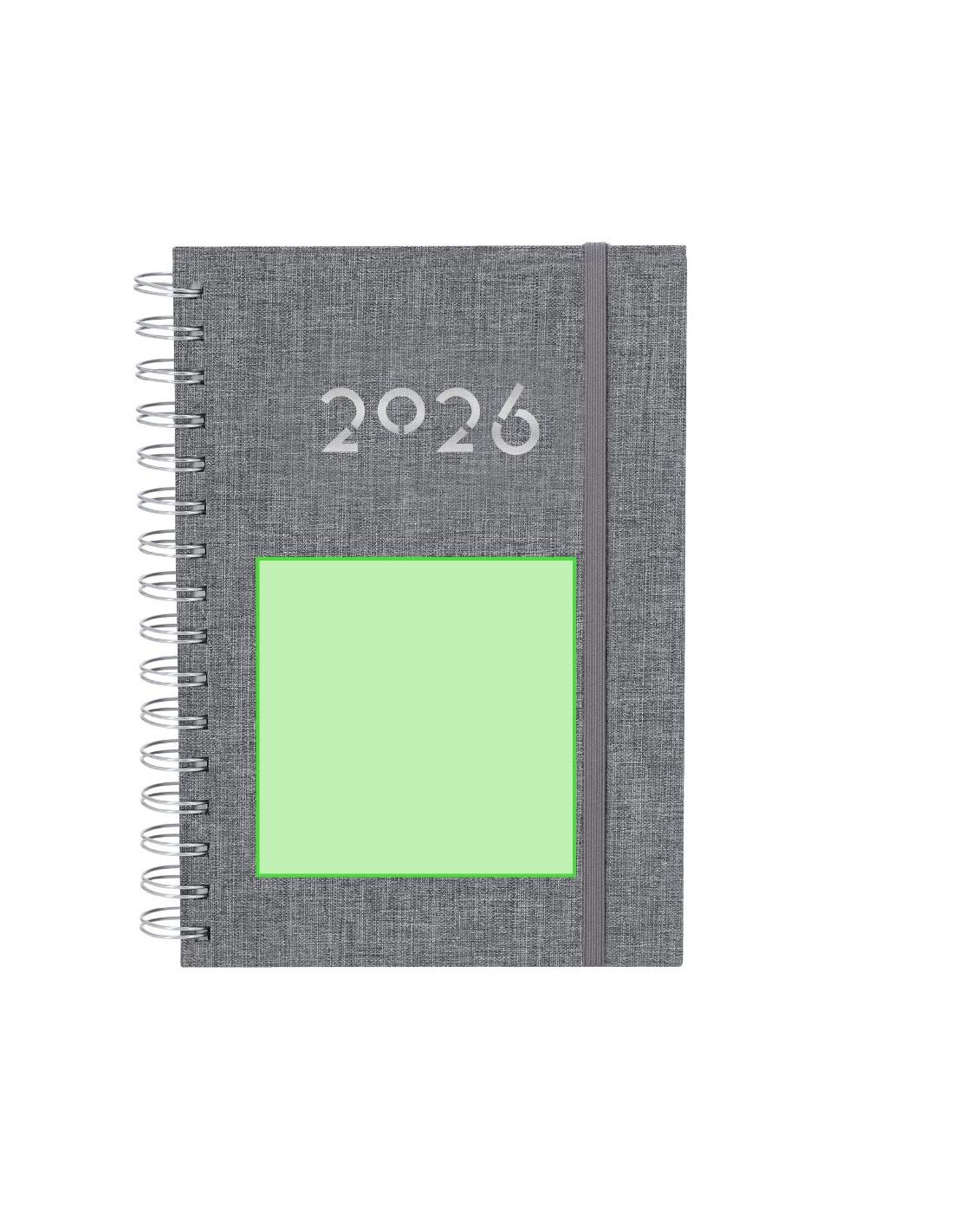Agenda de anillas tamaño A5 fabricada en suave poliéster RPET. Con tapas rígidas y cierre de goma elástica a juego. Incluye caja kraft de presentación. Cuenta con distintivo RPET.Diseño página día, zona de anotaciones y marcapáginas de tela. En 2 idiomas: castellano e inglés. El material RPET se elabora a partir de plástico reciclado, para así fomentar la reutilización de residuos plásticos y ayudar a la sostenibilidad del planeta.