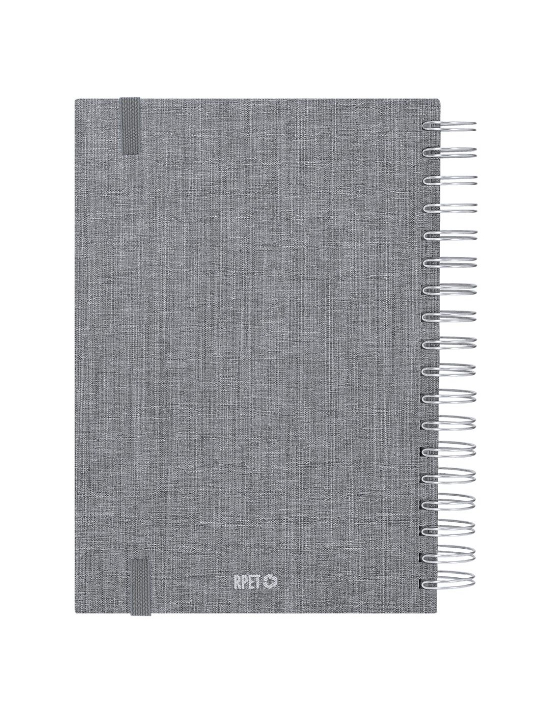 Agenda de anillas tamaño B5 fabricada en suave poliéster RPET. Con tapas rígidas y cierre de goma elástica a juego. Incluye caja kraft de presentación. Cuenta con distintivo RPET.Diseño semana vista, zona de anotaciones y marcapáginas de tela. En 2 idiomas: castellano e inglés. El material RPET se elabora a partir de plástico reciclado, para así fomentar la reutilización de residuos plásticos y ayudar a la sostenibilidad del planeta.
