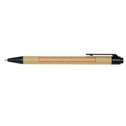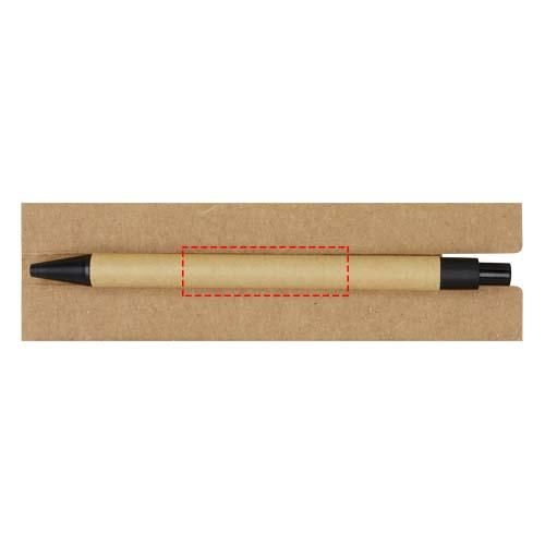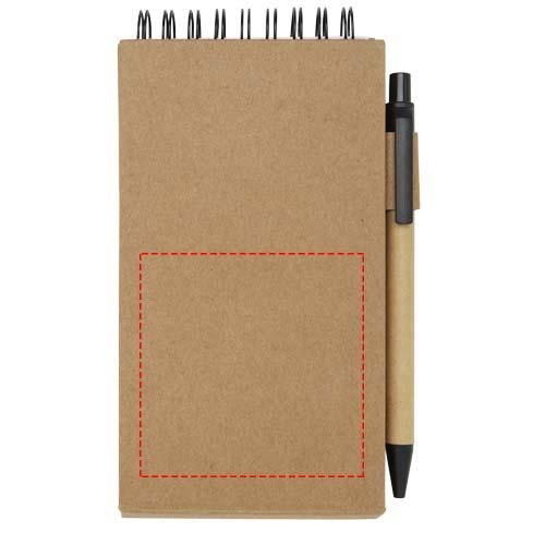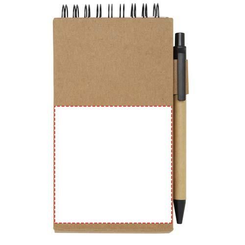 Bloc de notas adhesivas con bolígrafo. El bloc de notas tiene 30 hojas blancas de 70 g/m2 rayadas (8 x 12 cm). También tiene 25 notas adhesivas multicolores (5 x 1,2 cm) y 25 amarillas (7,5 x 7,5 cm), ambos tipos con papel de 70 g/m2. El cuerpo del bolígrafo está hecho de papel reciclado. Color de la tinta: Negro. Longitud de escritura: 1000 metros. Tamaño del plumín: 1,00 mm.