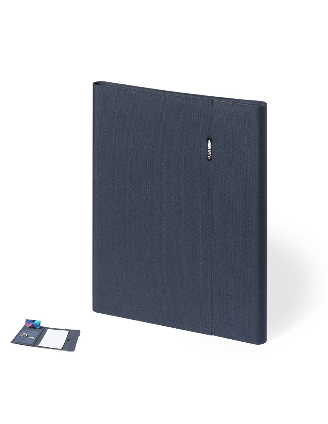 Carpeta fabricada en poliéster 600D RPET, elaborado a partir de plástico reciclado, para así fomentar la reutilización de residuos plásticos y ayudar a la sostenibilidad del planeta. Con cierre magnético y distintivo RPET. Interior con soporte para smartphone y multitud de compartimentos para tarjetas, incluidos soporte para bolígrafo y bloc con 20 hojas de disposición a una raya. Presentada en atractiva caja individual de diseño y disponible en variada gama de colores.
