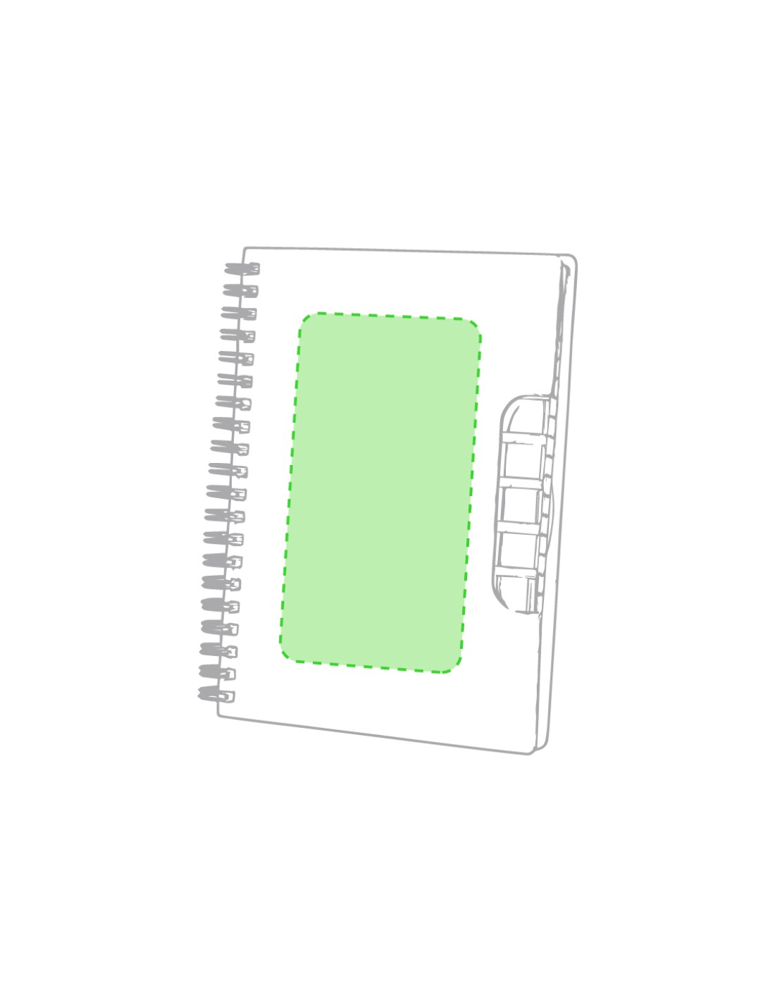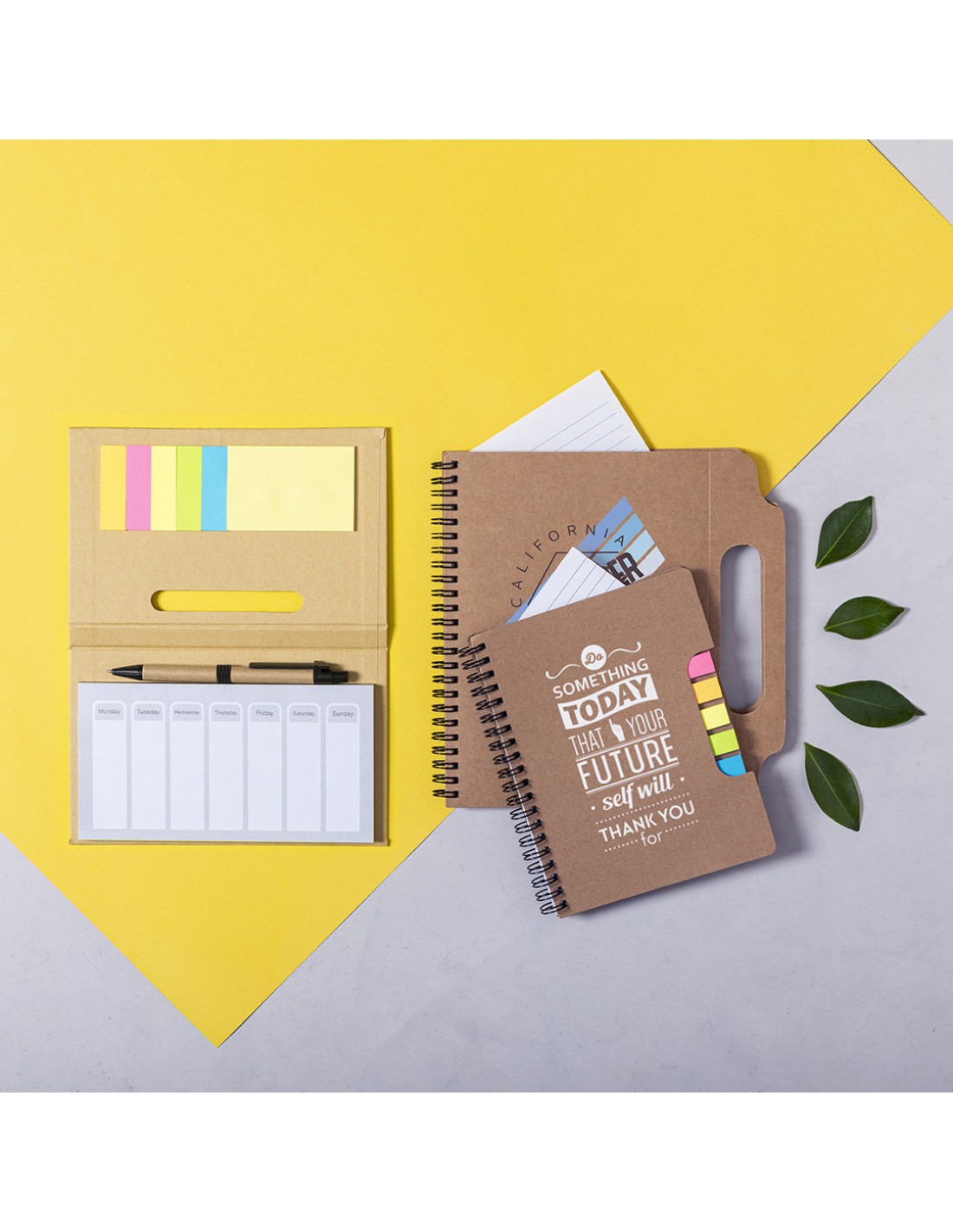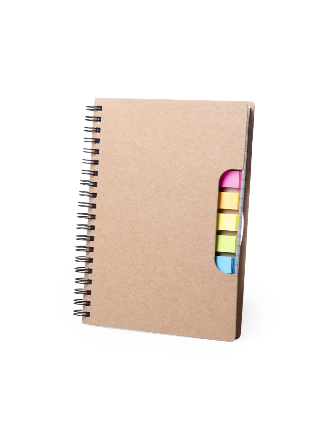 Libreta de anillas con tapas en cartón reciclado. Con original portada troquelada que muestra los colores de las notas adhesivas del interior. Incluye bloc de 60 hojas con disposición a una raya y 125 notas adhesivas pequeñas.