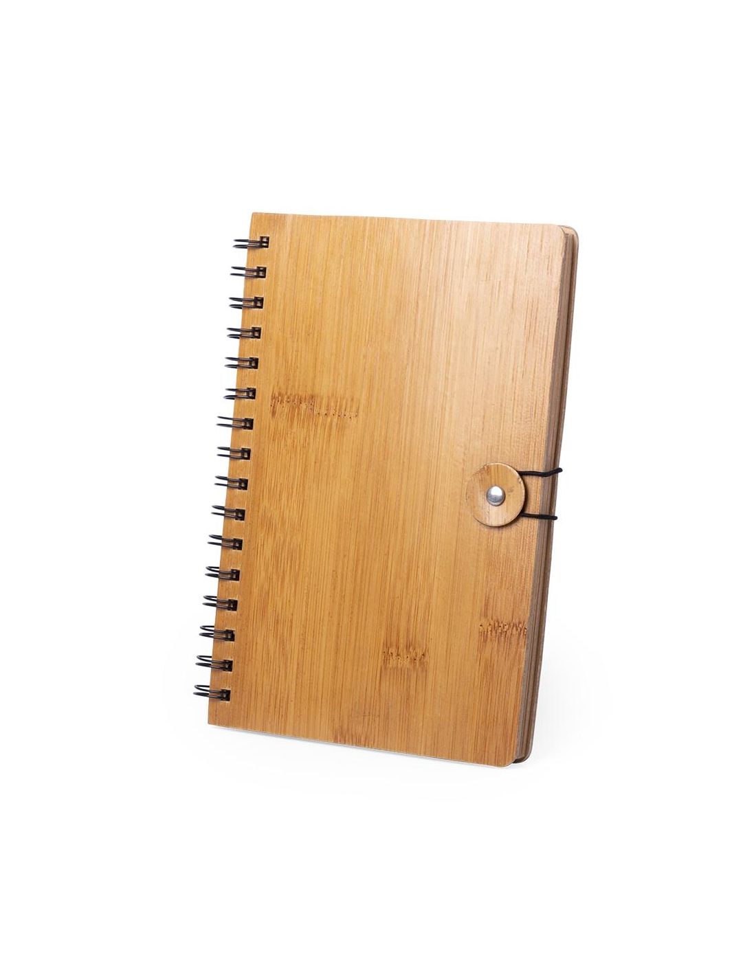 Libreta de anillas en línea nature con tapas rígidas de bambú y original cierre elástico. Incluye 80 hojas con disposición a una raya y diseño eco.