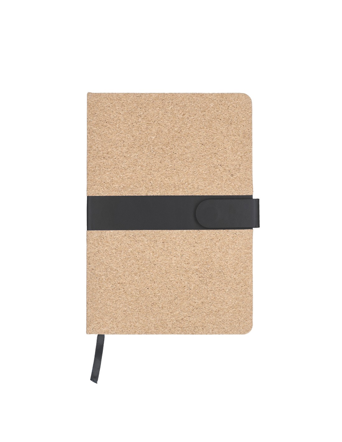 Bloc de notas A5 fabricado en corcho. Elegante diseño con banda central de PU y cierre magnético. Incluye 100 hojas color crema de disposición a una raya y marcapáginas de tela a juego.Elaborado con elementos vegetales para así fomentar la utilización de materias primas naturales y reducir las emisiones contaminantes.