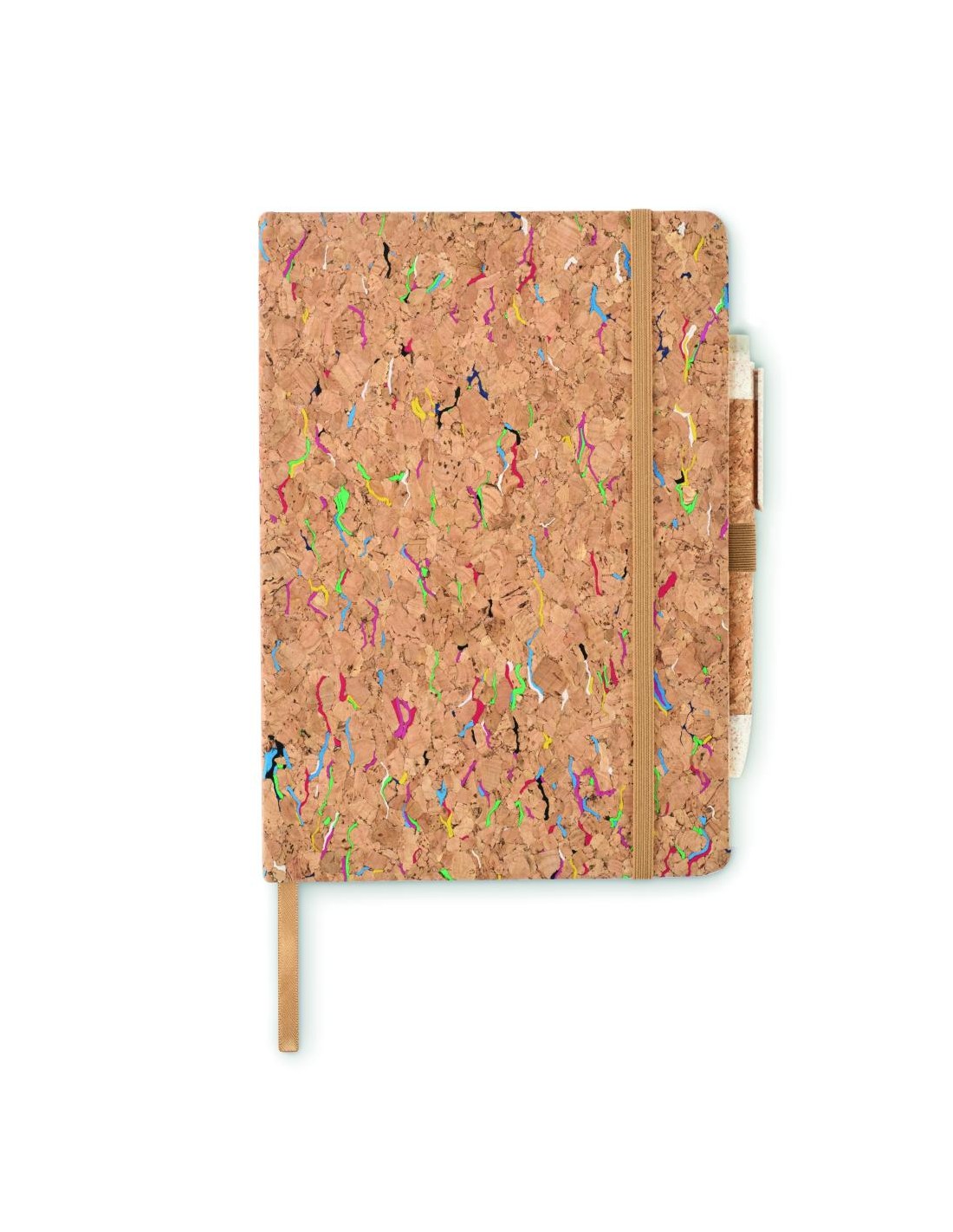 Libreta A5 con tapas de corcho duro coloreado. 96 hojas rayadas. Banda elástica, marca páginas y porta bolígrafos elástico.