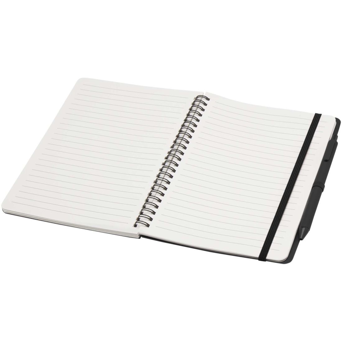 La libreta de tapa dura A5 está fabricada con plástico reciclado oceánico, con 80 hojas de papel rayado color crema de 70 g/m². La libreta tiene las esquinas redondeadas, un cierre elástico y un soporte para el bolígrafo. El bolígrafo de tinta negra también está fabricado con plástico reciclado oceánico. Longitud de escritura: 1000 metros. Tamaño del plumín: 1,0 mm.