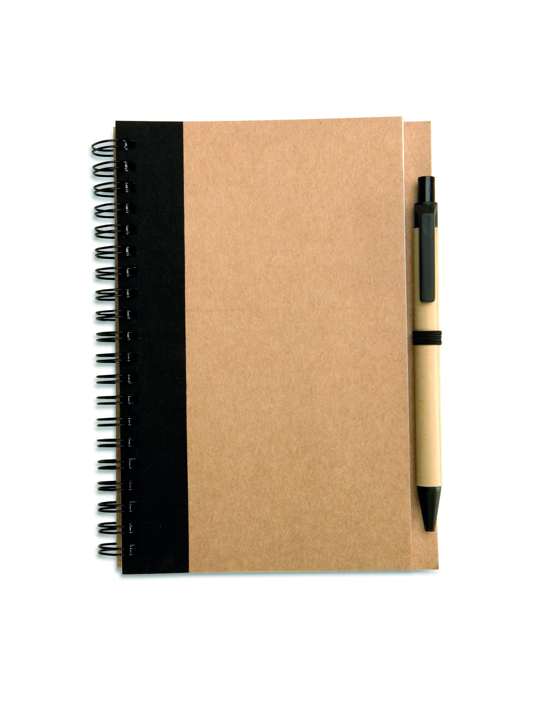 Libreta con 70 hojas de papel reciclado y bolígrafo de tinta azul hecho de cartón reciclado y plástico biodegradable.