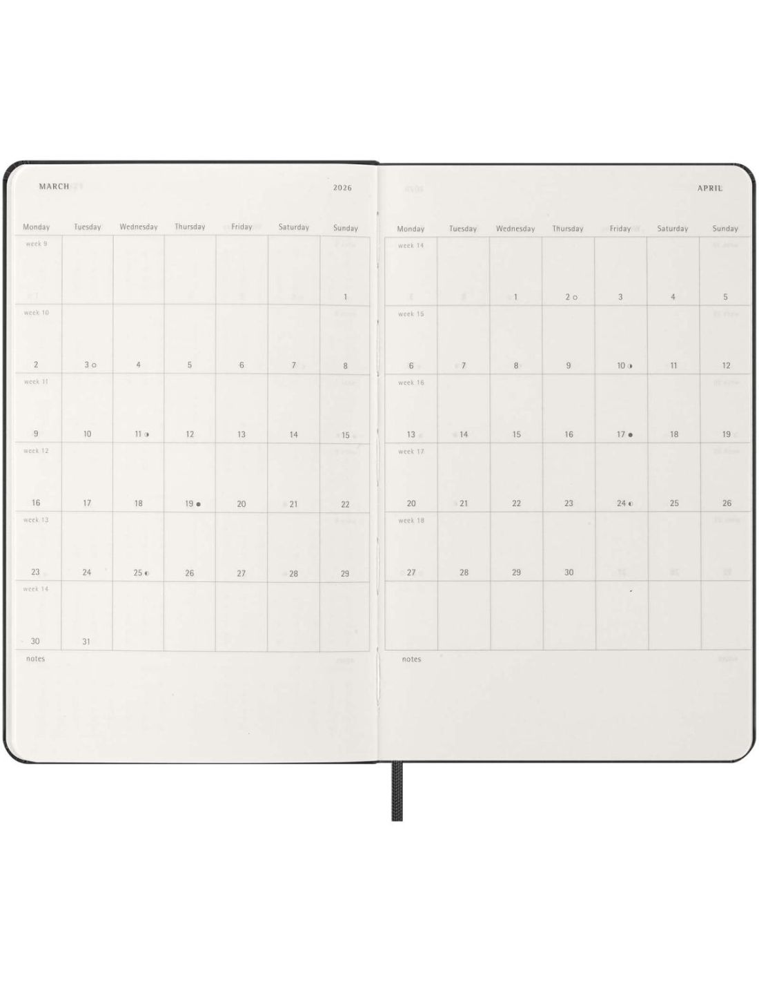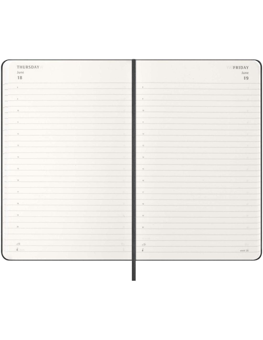 Planifica cada día al detalle con la agenda diaria de 12 meses con tapa dura \. Fechada de enero a diciembre de 2026, esta agenda tiene el formato de un día completo por página, para que dispongas de espacio suficiente para anotar eventos, citas, tareas pendientes, recordatorios y planes. A lo largo del año, se convierte en un registro físico diario de todo lo realizado. Incluye papel color marfil libre de ácidos, un cierre elástico negro, un marcapáginas de cinta, un bolsillo interior extensible de color a conjunto y adhesivos para la personalización, así como adhesivos del año para el lomo.