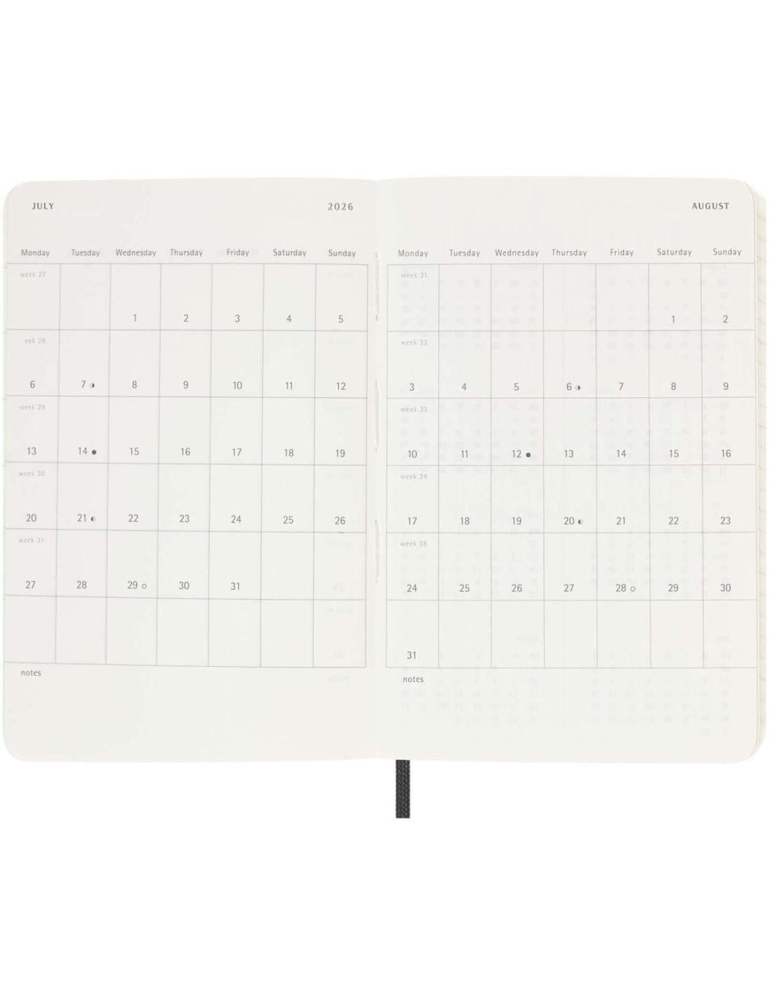Fechada de enero a diciembre de 2026, la agenda semanal para 12 meses de tapa blanda y tamaño de bolsillo \ muestra la semana completa de un vistazo, al tiempo que ofrece páginas con vista anual y mensual para una visión más amplia del año, seguidas de páginas para planificar viajes, ideas y objetivos. Los días de cada semana se muestran en una cara, mientras que la opuesta es una página rayada para tareas y notas. Incluye papel color marfil libre de ácidos, un cierre elástico negro, un marcapáginas de cinta, un bolsillo interior extensible de color a conjunto y adhesivos para la personalización, así como adhesivos del año para el lomo.