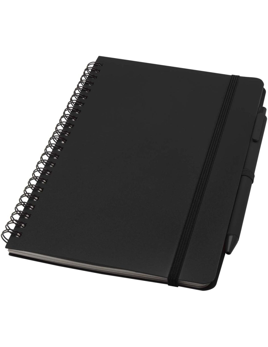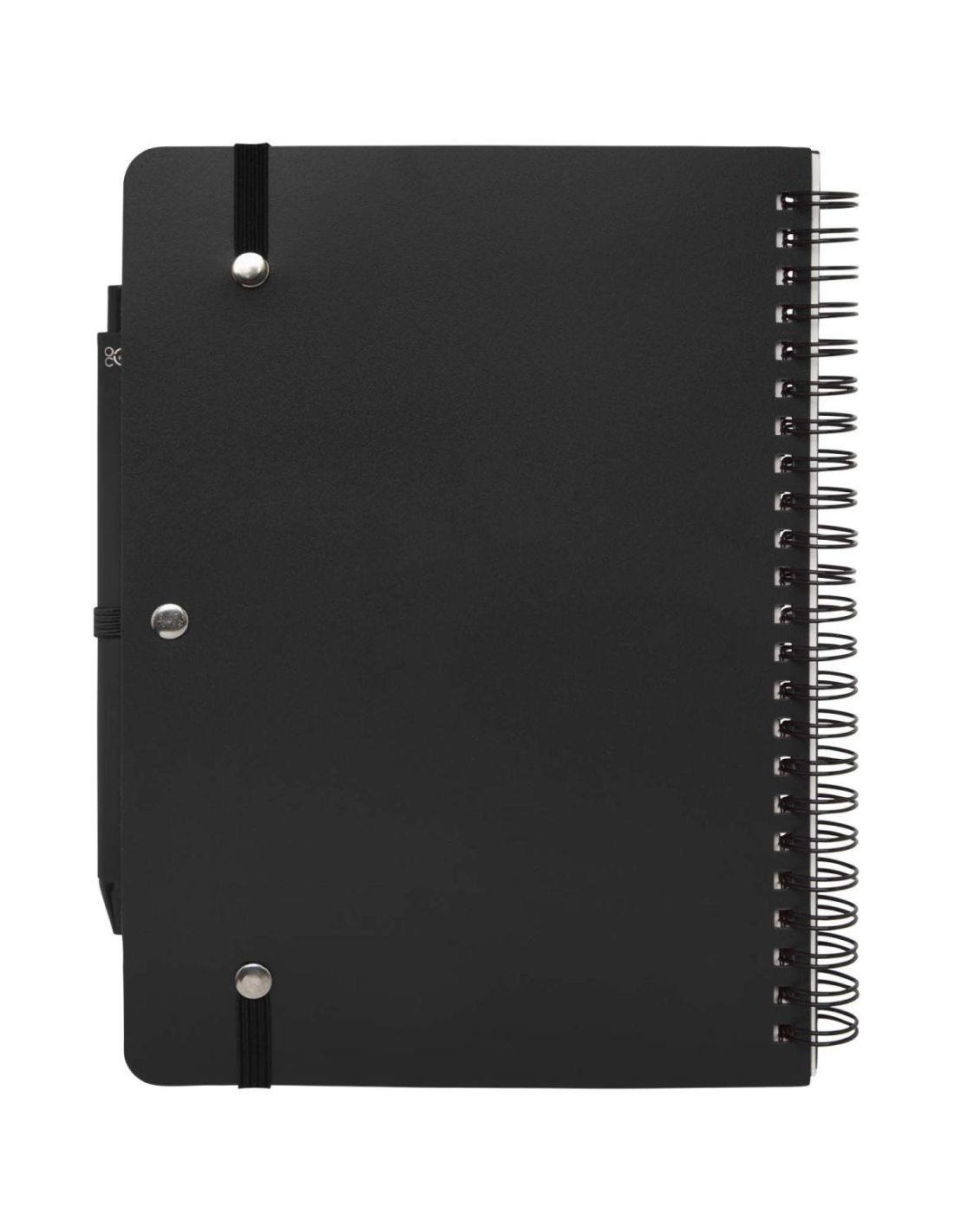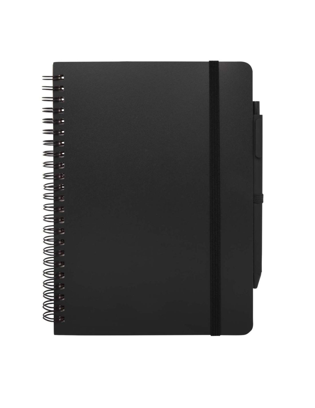 La libreta de tapa dura \ A5 está fabricada con plástico reciclado oceánico, con 80 hojas de papel rayado color crema de 70 g/m². La libreta tiene las esquinas redondeadas, un cierre elástico y un soporte para el bolígrafo. El bolígrafo de tinta negra también está fabricado con plástico reciclado oceánico. Longitud de escritura: 1000 metros. Tamaño del plumín: 1,0 mm.