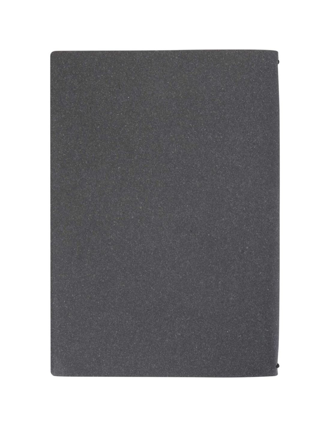 La libreta A5 \ rellenable tiene una cubierta de plástico reciclado con un cierre elástico que sujeta con seguridad dos cuadernos interiores, uno de puntos y otro de rayas. Cada cuaderno incluye 32 hojas de color crema fabricadas en papel de 70 g/m², con esquinas redondeadas y costura visible en el lomo para un aspecto artesanal. Las tapas de los cuadernos son de cartón. Los recambios están disponibles por separado en varios diseños, como punteado, planificador y rayado.
