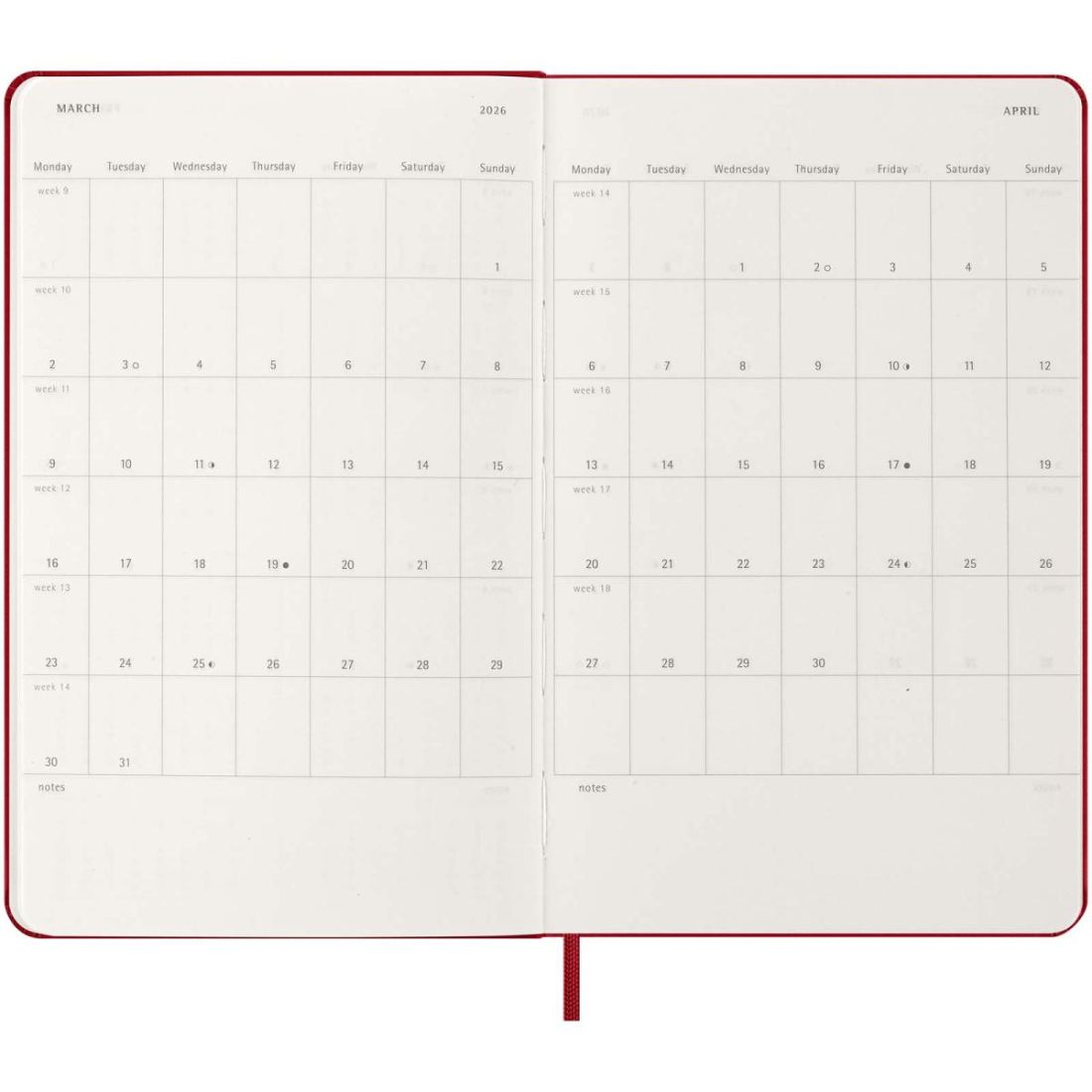 Fechada de enero a diciembre de 2026, la agenda semanal para 12 meses de tapa dura muestra toda la semana de un vistazo, al tiempo que ofrece páginas con vista anual y mensual para una visión más amplia del año, seguidas de páginas para planificar viajes, ideas y objetivos. Los días de cada semana se muestran en una cara, mientras que la opuesta es una página rayada para tareas y notas. Incluye papel color marfil libre de ácidos, un cierre elástico negro, un marcapáginas de cinta, un bolsillo interior extensible de color a conjunto y adhesivos para la personalización, así como adhesivos del año para el lomo.
