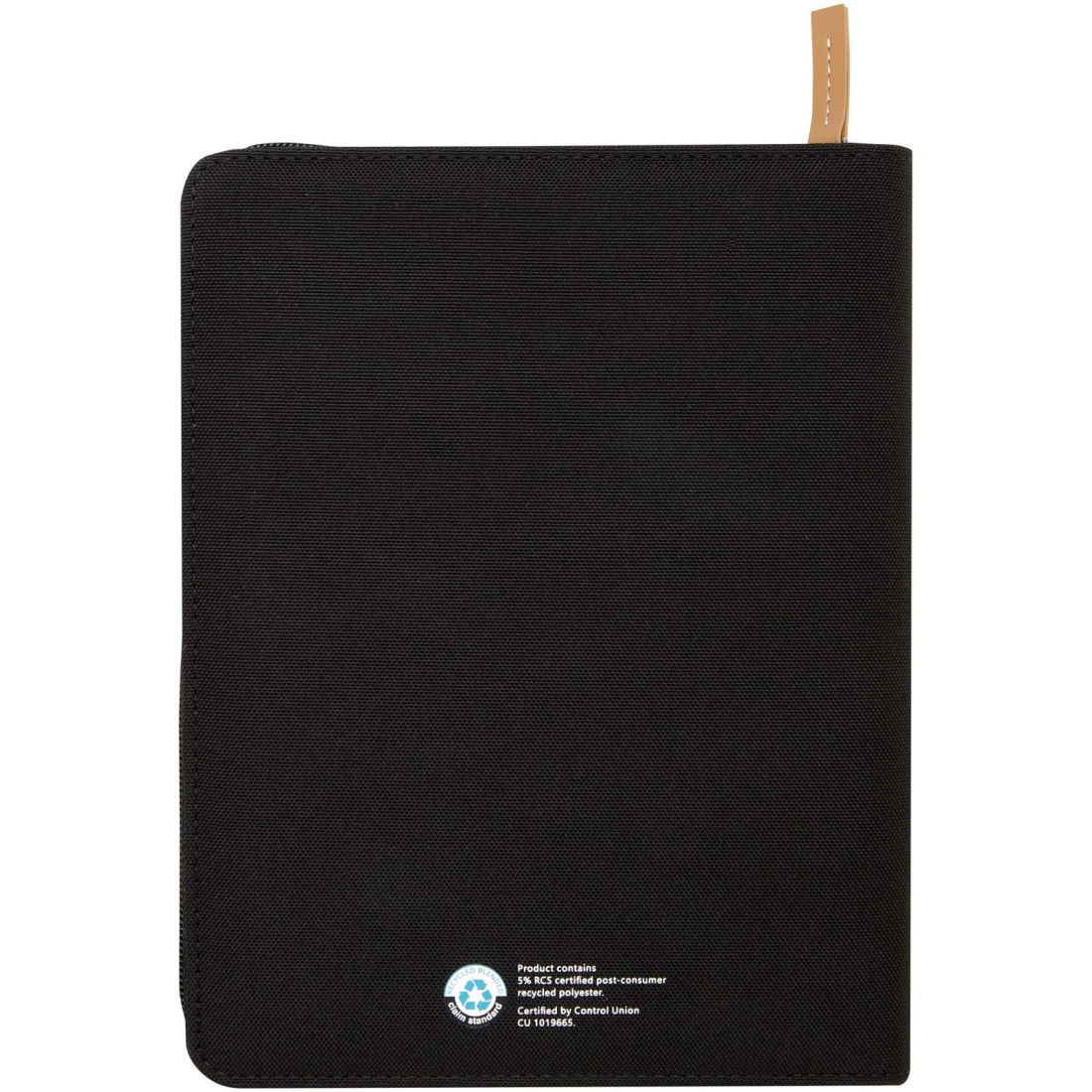 El portafolios A5 con esquinas redondeadas es un práctico artículo de oficina fabricado con plástico reciclado. Cuenta con 64 hojas rayadas color crema de 80 g/m2, cierre de cremallera, soporte para bolígrafo y bolsillo en acordeón.