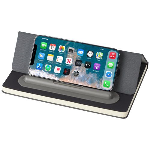 El set de bolígrafo y libreta cuenta con certificación RCS y está parcialmente fabricado con poliéster posconsumo reciclado, por lo que es una opción más sostenible al reducir el uso de materia prima virgen. Dispone de una tapa plegable que lo convierte en un soporte para el móvil. Incluye un bolígrafo de tinta azul y 80 hojas rayadas de papel reciclado de 80 g/m² en color crema procedente de fuentes sostenibles. La longitud de escritura del bolígrafo es de 1000 metros.