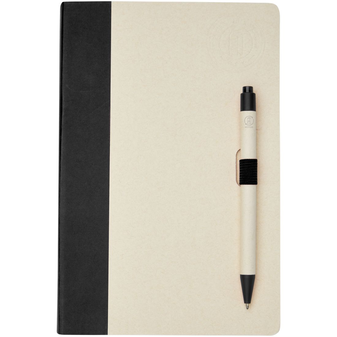 Set de libreta de referencia de tamaño A5 y bolígrafo. La libreta cuenta con 80 hojas con líneas (80 g/m²) hechas a partir de cartones de leche reciclados (hasta un 70 %), un lomo de papel de color y un soporte para bolígrafo. En el soporte, hay un bolígrafo con mecanismo de presión en el color correspondiente de la libreta. El bolígrafo tiene el cuerpo hecho del mismo material de cartón de leche reciclada y el botón, la pinza y la punta están hechos de plástico PLA coloreado. El bolígrafo cuenta con una recarga de negro en el interior. Los cartones de leche usados se recogen, clasifican, procesan y convierten en papel, por lo que los residuos se transforman en un producto útil.