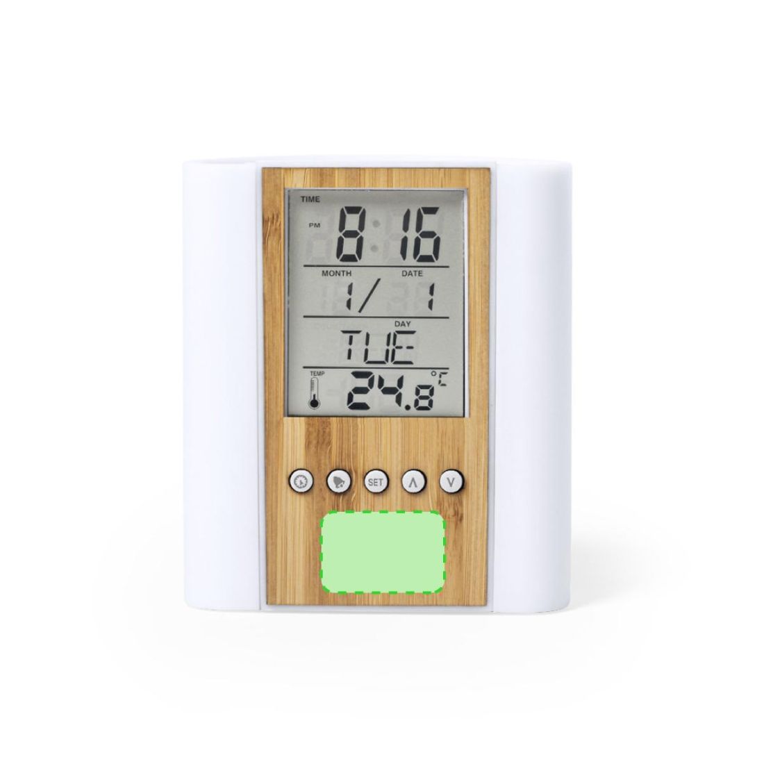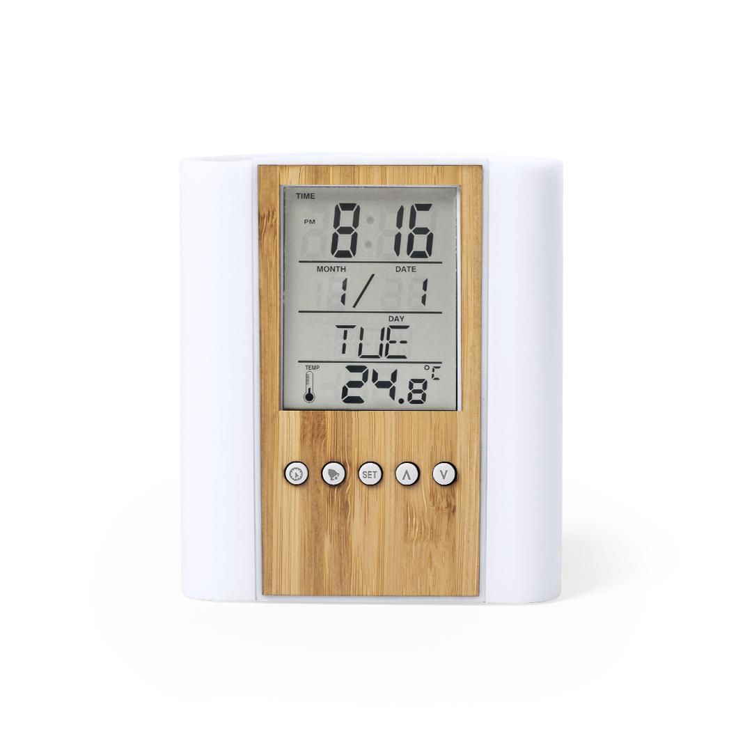Lapicero de línea nature con reloj multifunción integrado. Fabricado en combinación de materiales bambú y ABS. Funciones termómetro, calendario y...
