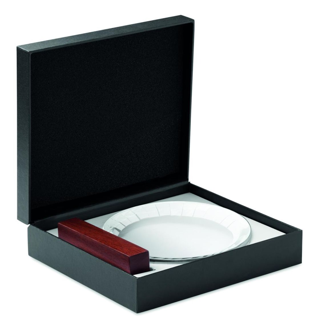 Trofeo o placa conmemorativa redonda de cristal sobre una base de madera de haya presentado en una caja de regalo.