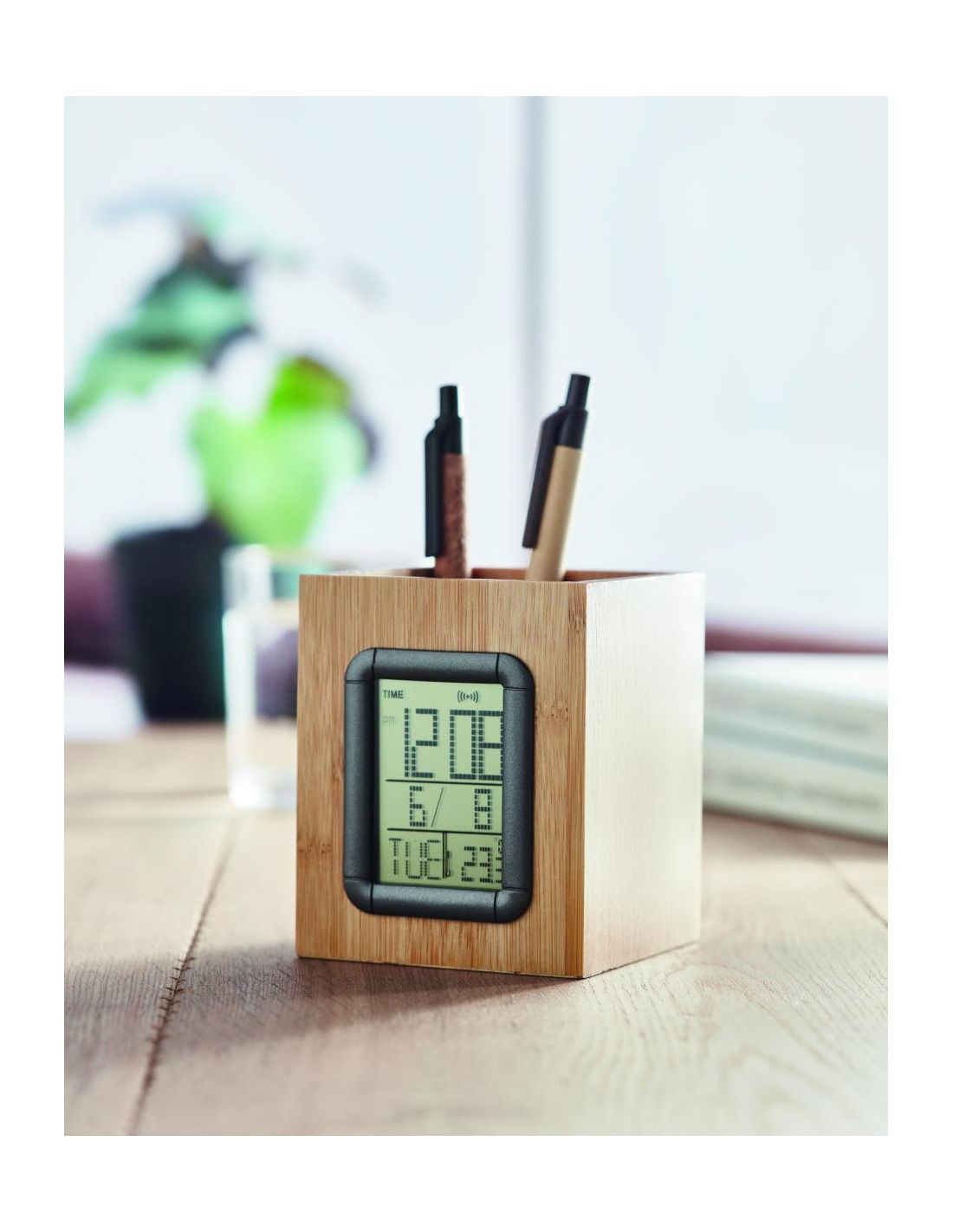 Porta bolígrafos de bambú con calendario, despertador y termómetro. Incluye 2 pilas de botón. El bambú es material natural, el color del articulo puede variar.