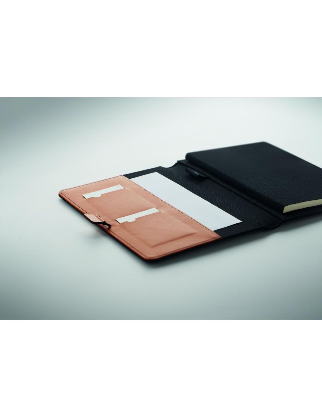 Portadocumentos A5 en RPET con detalles de piel sintética. Libreta A5 recargable con tapa de corcho duro. Encuadernado. 128 pág. rayadas de papel reciclado (64 hojas). Portabolígrafos. 2 tarjeteros y un compartimento grande. Cierre elástico con detalle metálico. FSC®-certified | FSC MIX, P8.6, FSC-C213206