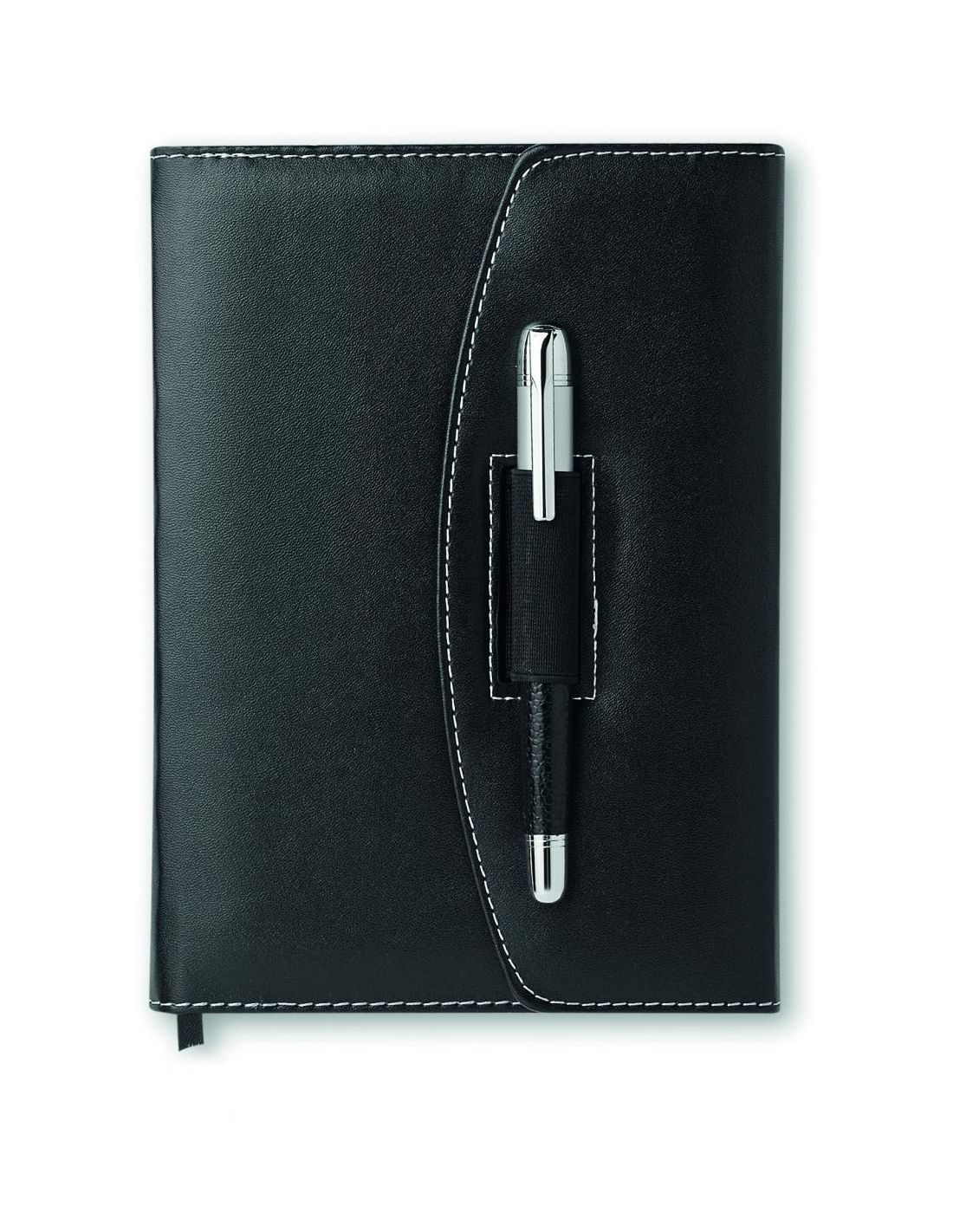 Portafolios tamaño A5, incluye bloc de 120 páginas y bolígrafo metálico. Material PU. Tinta negra.