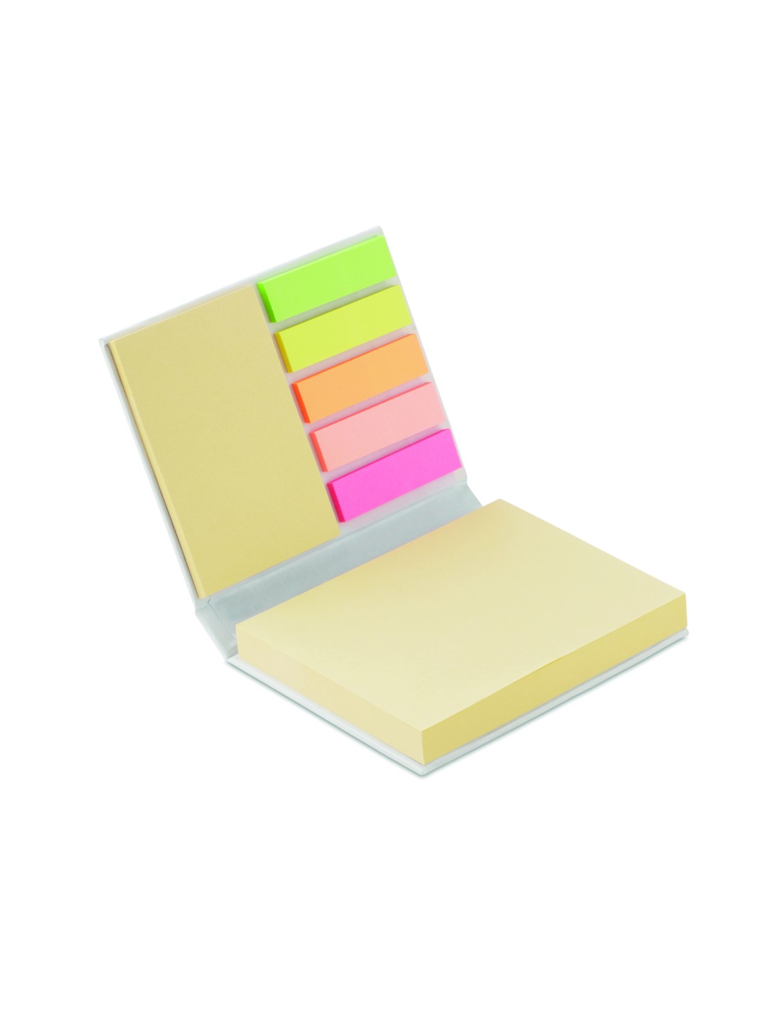 Set de notas de papel reciclado compuesto de 1 bloc grande, 1 bloc mediano de notas amarillas y 5 blocs pequeños de notas brillantes.