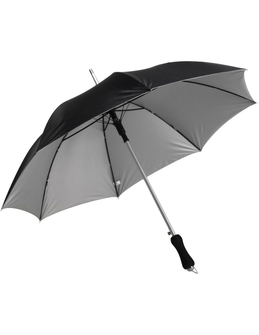 Paraguas automático de 8 paneles de poliéster (210 T), puño recto de EVA, caña y varillas de metal, cierre botón. Exterior del paraguas coloreado, interior en acabado metalizado.