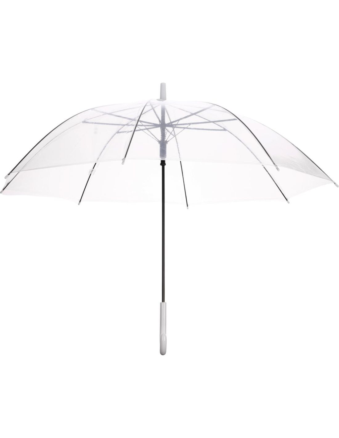 Paraguas automático y transparente de 8 paneles de POE. Varillas y caña de metal, mango de plástico y cierre con botón.