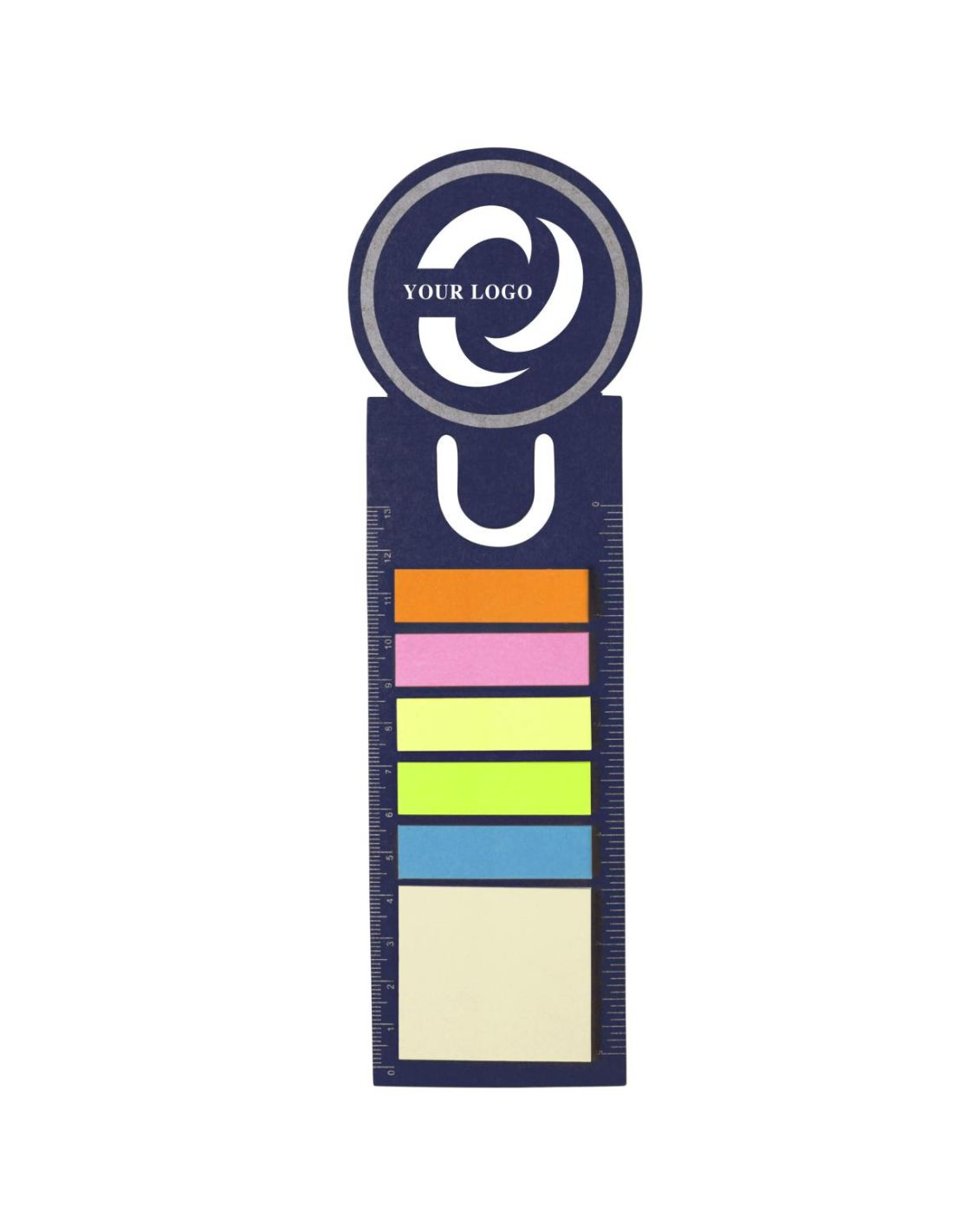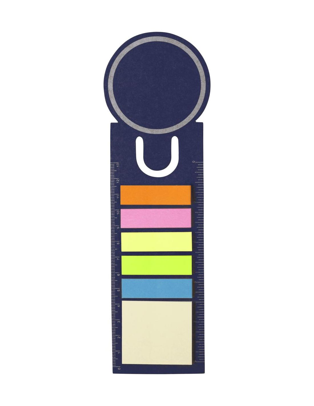 Marcapáginas de cartón con forma redondeada en el extremo superior. Con regla en ambos lados, 5 tiras adhesivas en varios colores y memo de 4 x 4,5…