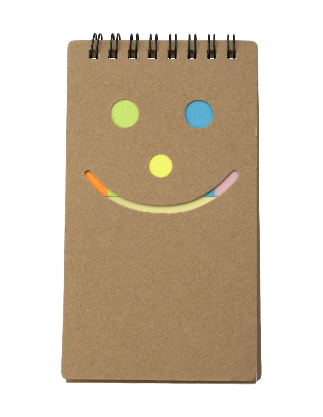 Bloc de notas de cartón con espiral. Tiene 150 tiras adhesivas en diferentes colores y 50 hojas lineadas.