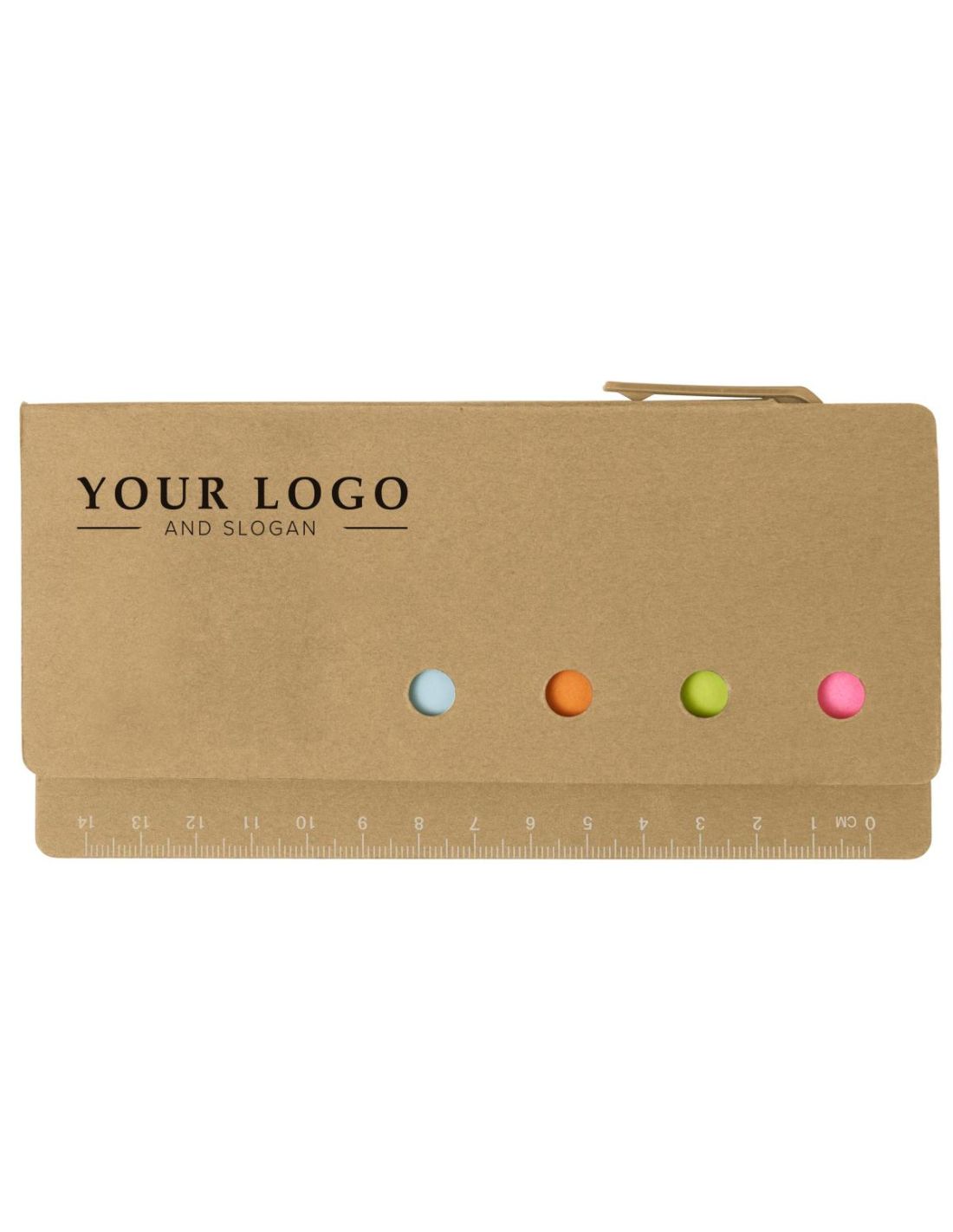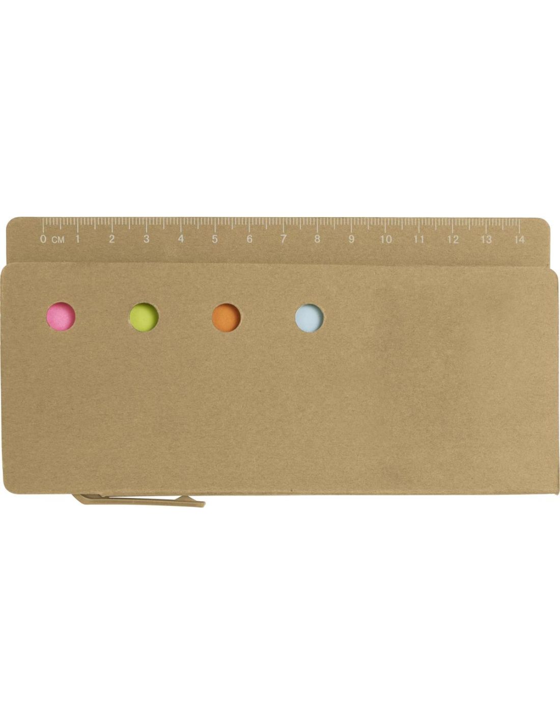 Porta memos de cartón con regla (13 cm) y bolígrafo de cartón con tinta azul. 100 memos adhesivos entre 4 tiras en diferentes colores y un bloc de memos en color amarillo más grande.
