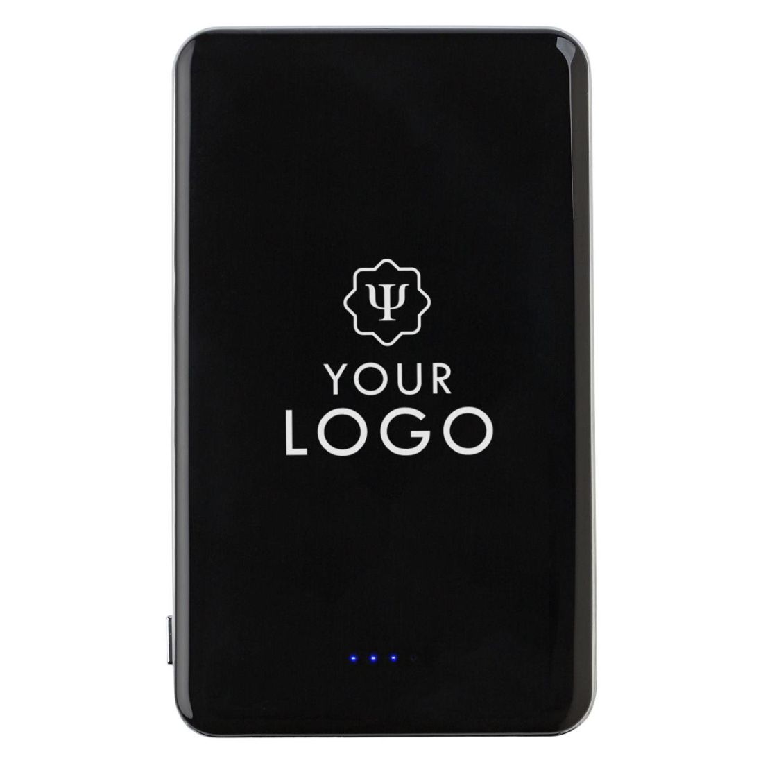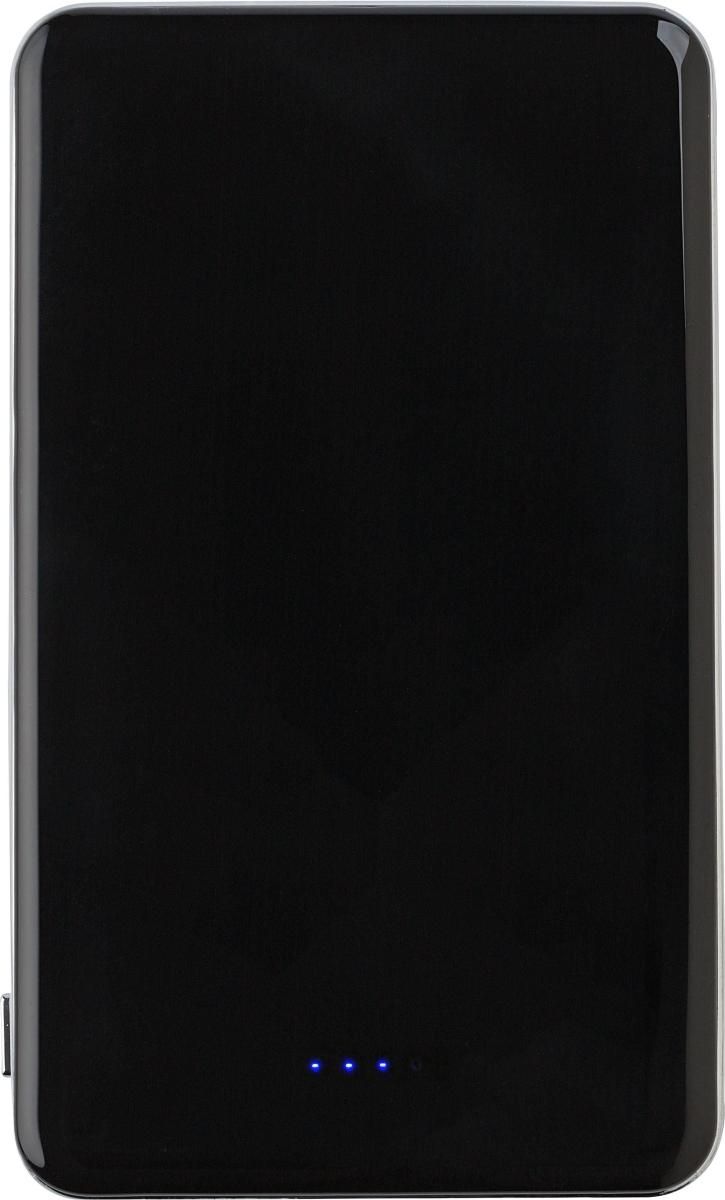 Power Bank de ABS con batería LiPo. 5000mAh, Input 5V1A, Output 1A/2.1/A/5V. Ambas caras son brillantes y con un ribete plateado. Incluye 5 LED azu…