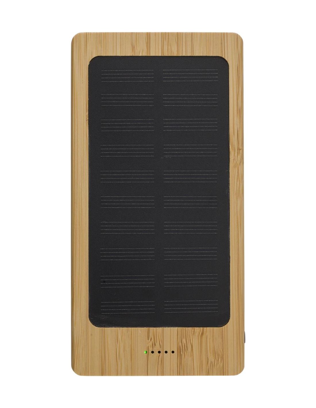 Power Bank solar de bambú, de 8.000 mAh. Dos puertos USB y un puerto micro USB y cuatro indicadores LED. Entrada: DC 5V / 2A, salida: DC 5V / 2A. Cable incluido.